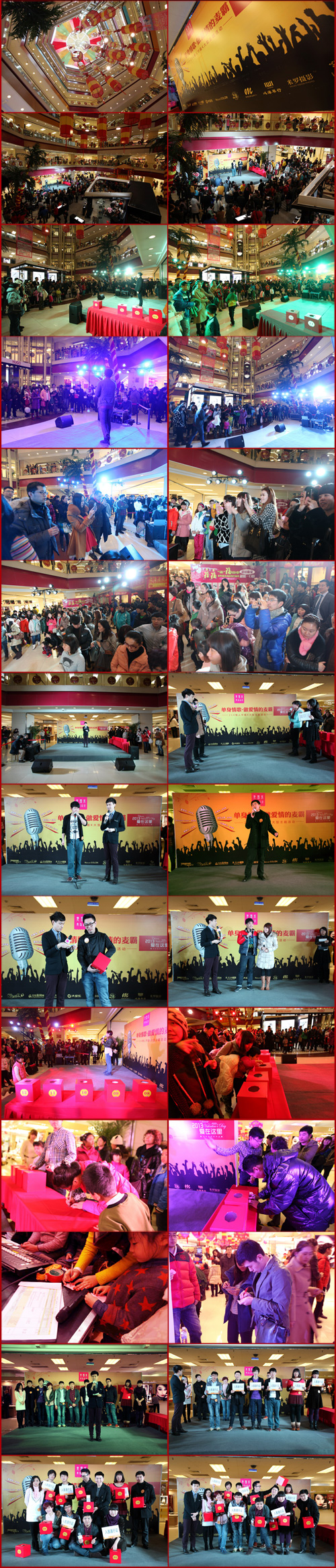 2013年2月14日情人節(jié)下午,在青島麥凱樂的一樓大堂中庭,FM91.5青島音樂體育廣播《915全城熱戀》聯合麥凱樂青島總店、青島新聞網、鳳凰網青島站、青島Natural Color本色酒吧、大家樂KTV、星期八KTV、音樂之聲KTV、心海琴行、麥凱樂米羅攝影以及鉆石小鳥等聯合發(fā)起的『單身情歌?做愛情的“麥”霸』大型唱K主題活動,之首場比賽12晉6“直通復賽”如期舉行。 “直通復賽”參賽標準為2月12日前報名并申請參賽的選手,共12人;出場順序以選手在新聞網“歌作展示”頁面的網投票數為依據;12名選手12只投票箱,以現場觀眾的投票數為晉級依據。