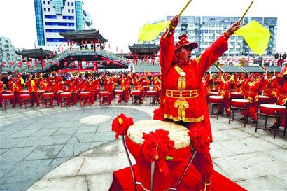 上午10時(shí)28分,海云廣場(chǎng)鑼鼓震天,百人組成的威風(fēng)鑼鼓隊(duì)用手中的鑼鼓啟動(dòng)海云庵糖球會(huì)開(kāi)街儀式。今年的糖球會(huì)開(kāi)街儀式?jīng)]有明星大腕,也沒(méi)有舞臺(tái)演出,簡(jiǎn)短的開(kāi)街儀式過(guò)后,社區(qū)居民巡游方隊(duì)進(jìn)入會(huì)場(chǎng),與現(xiàn)場(chǎng)趕會(huì)市民舞動(dòng)起來(lái)。首先進(jìn)場(chǎng)的是貨郎巡游方隊(duì),裝扮成老貨郎的居民挑著貨挑子、扛著糖球草靶子,嘴里吆喝著“賣(mài)糖球來(lái)”走進(jìn)會(huì)場(chǎng),讓市民感受老青島貨郎在街頭做買(mǎi)賣(mài)的場(chǎng)景。隨后出現(xiàn)的是高蹺巡游隊(duì)和秧歌隊(duì)。社區(qū)大媽們揮舞著腰間的紅綢,和趕會(huì)市民一起扭著大秧歌。此時(shí),海云廣場(chǎng)北側(cè)的糖球會(huì)城門(mén)緩緩打開(kāi),趕會(huì)市民和巡游隊(duì)伍一同進(jìn)城趕會(huì)。