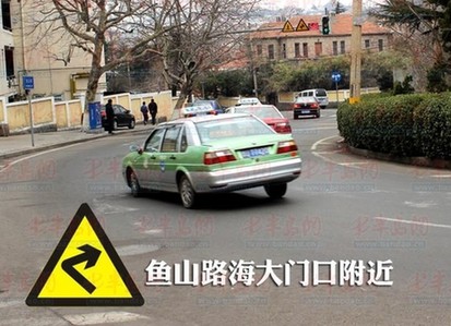 ????在魚山路中國海洋大學門口附近路段,連續(xù)4個下坡急轉(zhuǎn)彎的路口暗藏危險。為了保障從學校里進出車輛和行人的安全,海大門口的位置設置了一處紅綠燈,當紅燈禁行時,剛從前一個轉(zhuǎn)彎路口行駛過來的車輛不得不緊急剎車。如果車速過快,很容易造成追尾事故。