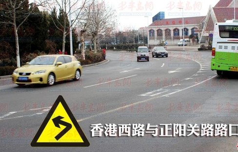 ????“前面路口有個急彎,開車可得慢點。”25日,根據(jù)袁師傅提到的幾處危險路段,記者乘車來到其中之一的香港西路與正陽關路路口,在沿香港西路自東向西行駛到該路口時,右拐彎度極大的路口十分考驗司機的駕駛技術。