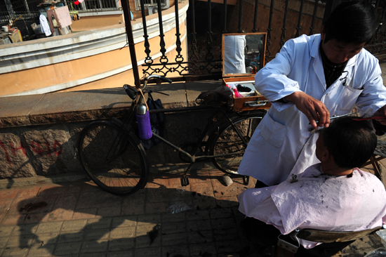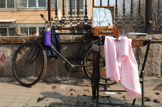 一輛二八自行車(chē),一張破椅子,一個(gè)工具箱,這就是剃頭匠賈師傅的所有工具?!斑@個(gè)自行車(chē)從我干這行就一直陪著我,這把椅子也得有20多年了?!?張力偉 攝