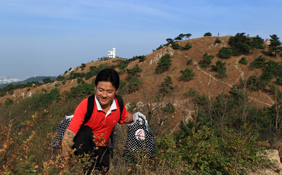 ??? 青島新聞網(wǎng)3月8日訊 工作中,他是西裝革履的銀行客戶經(jīng)理,是黨員示范崗的優(yōu)秀代表;到了周末,他好像變成了另一個(gè)人,戴著太陽(yáng)帽和線手套、背著裝滿編織袋的特制大書包、拿著一米長(zhǎng)的巨型鑷子。九年來(lái),他翻山越嶺、走遍崎嶇山路,用自己的雙腳丈量浮山每一寸土地,用雙手拾遍漫山垃圾。他就是王德洋,青島人更愿意稱呼他“青島環(huán)保哥”。