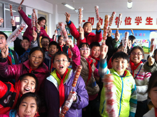 劉老師請(qǐng)同學(xué)們吃冰糖葫蘆,同時(shí)告訴大家,冰糖葫蘆就像學(xué)習(xí)一樣,先酸后甜