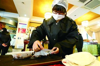 隨后工作人員又在李滄海鼎海鮮酒樓抽取了生牛肉和熟豬肘兩份肉制品樣品,在丹香食品公司的生產基地出貨區(qū)抽取了3種貯備出貨的糕點?!笆卟酥饕獧z測50項農藥殘留,肉制品主要檢測細菌等微生物指標和色素、瘦肉精等理化指標,糕點主要檢測細菌等微生物指標和色素、防腐劑等添加劑。”畢洪玲說,蔬菜的農殘檢測速度稍快,而肉制品等的細菌檢測則需要一段時間,因為一些檢測項目要做細菌培養(yǎng)。