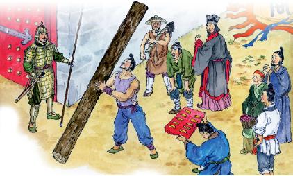 ????春秋戰(zhàn)國時(shí),秦國的商鞅在秦孝公的支持下主持變法。當(dāng)時(shí)處于戰(zhàn)爭(zhēng)頻繁、人心惶惶之際,為了樹立威信,推進(jìn)改革,商鞅下令在都城南門外立一根三丈長(zhǎng)的木頭,并當(dāng)眾許下諾言:誰能把這根木頭搬到北門,賞金十兩。圍觀的人不相信如此輕而易舉的事能得到如此高的賞賜,結(jié)果沒人肯出手一試。于是,商鞅將賞金提高到50金。重賞之下必有勇夫,終于有人站起將木頭扛到了北門。商鞅立即賞了他五十金。商鞅這一舉動(dòng),在百姓心中樹立起了威信,而商鞅接下來的變法就很快在秦國推廣開了。新法使秦國漸漸強(qiáng)盛,最終統(tǒng)一了中國。