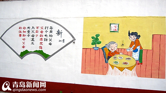 ????“每周給父母打一個(gè)電話;父母的零花錢不能少;為父母獎(jiǎng)勵(lì)關(guān)愛(ài)卡;自信聆聽(tīng)父母的往事”“常跟父母做交心的溝通,帶父母一起出席重要的活動(dòng),帶父母參觀你工作的地方,帶父母去旅行或故地重游”……筆者發(fā)現(xiàn)這些新的敬老規(guī)范被寫(xiě)進(jìn)了新24孝圖中。在東閣街道東關(guān)村,村中街道清潔、排列有序,中心街兩側(cè),新粉刷的房屋墻壁上,都已經(jīng)繪上了漂亮的文化圖像,新二十四孝圖、傳統(tǒng)文化國(guó)畫(huà),描繪的尊老、愛(ài)幼、仁愛(ài)、節(jié)儉等中國(guó)夢(mèng)系列繪畫(huà),圖文并茂,令人感動(dòng);代家上觀描繪的是京劇臉譜、風(fēng)景等等,致力于打造傳統(tǒng)國(guó)畫(huà)一條街;尚家上觀書(shū)寫(xiě)的是提倡現(xiàn)代健康生活、優(yōu)生優(yōu)育的標(biāo)語(yǔ)……這些美麗的宣傳畫(huà),以賞心悅目的美景,整潔優(yōu)美的文字,清新活潑的語(yǔ)言,引導(dǎo)民眾樹(shù)立健康文明的生活方式,吸引了諸多村民前來(lái)觀看。