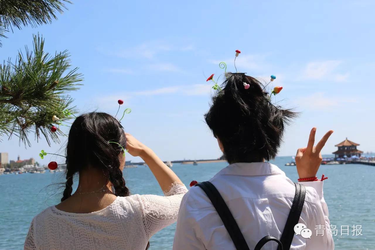 ????男女老少頭上都“長”出了樹葉、卷卷草、豆芽、蘑菇、蘋果、櫻桃,簡直是全民賣萌?。∏鄨?bào)君覺得棧橋景區(qū)就像植物園,滿眼都是些行走的花花草草!