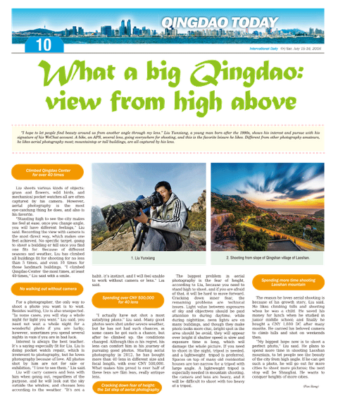 ????“My biggest hope now is to shoot a perfect photo,” Liu said. He plans to spend more time in shooting Laoshan mountain, to let people see the beauty of the city from high angle. If he can get such a photo, he will go out for more cities to shoot more pictures; the next stop will be Shanghai. He wants to conquer heights of more cities.