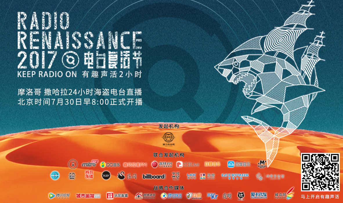 2017電臺復活節(jié)活動,將在北京時間7月30日上午8點震撼開播,15位來自全球各地的電臺主播將在撒哈拉開始24小時不間斷電臺直播,借助電臺聲波讓沙漠與城市連接,感受純粹音樂的力量,倡導人們暫離雜亂爆炸的信息,重拾美好的電臺記憶,安靜享受2小時的電臺陪伴,用行動去支持那些一直致力于制作優(yōu)秀內(nèi)容的電臺DJ,向海盜電臺致敬