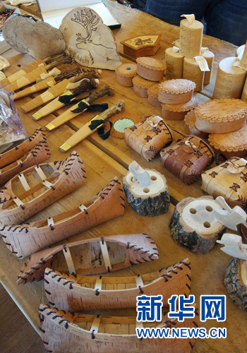 ????樺樹船、皮包、馴鹿鹿角項鏈、耳環(huán)......各種手工藝品獨(dú)具民族特色,上面的馴鹿形態(tài)優(yōu)美,靈動活潑。
