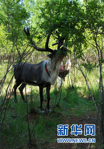 6月22日,敖魯古雅使鹿部落景區(qū),正在啃樹葉的馴鹿。新華網(wǎng) 張敏彥攝