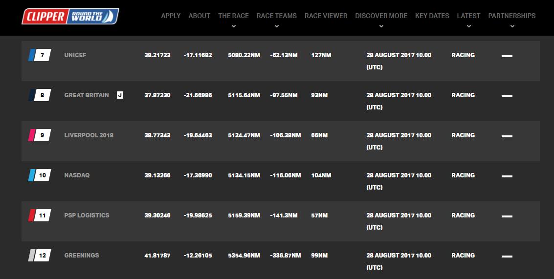 船隊(duì)中排位靠后的賽隊(duì)中,有一些還沒有完全從這股北風(fēng)中嘗到甜頭。第十一位的‘PSP物流號(hào)’賽隊(duì)船長(zhǎng)Roy Taylor說到:“向著西南方向行進(jìn)了一段不錯(cuò)的里程以后,我們又遇到了另一股弱風(fēng)帶。我們?cè)噲D行駛到亞速爾高壓帶的南邊去找不錯(cuò)的風(fēng)況,這樣能把我們直接帶到佛得角。進(jìn)程比較慢,我們想在下一次從Simon Rowell(克利伯帆船賽氣象專家)獲得天氣預(yù)告的時(shí)候再考慮考慮如何繼續(xù)行駛。”
