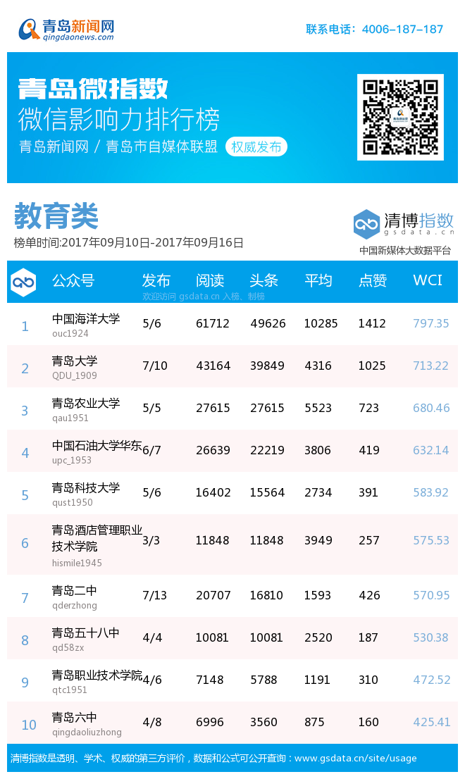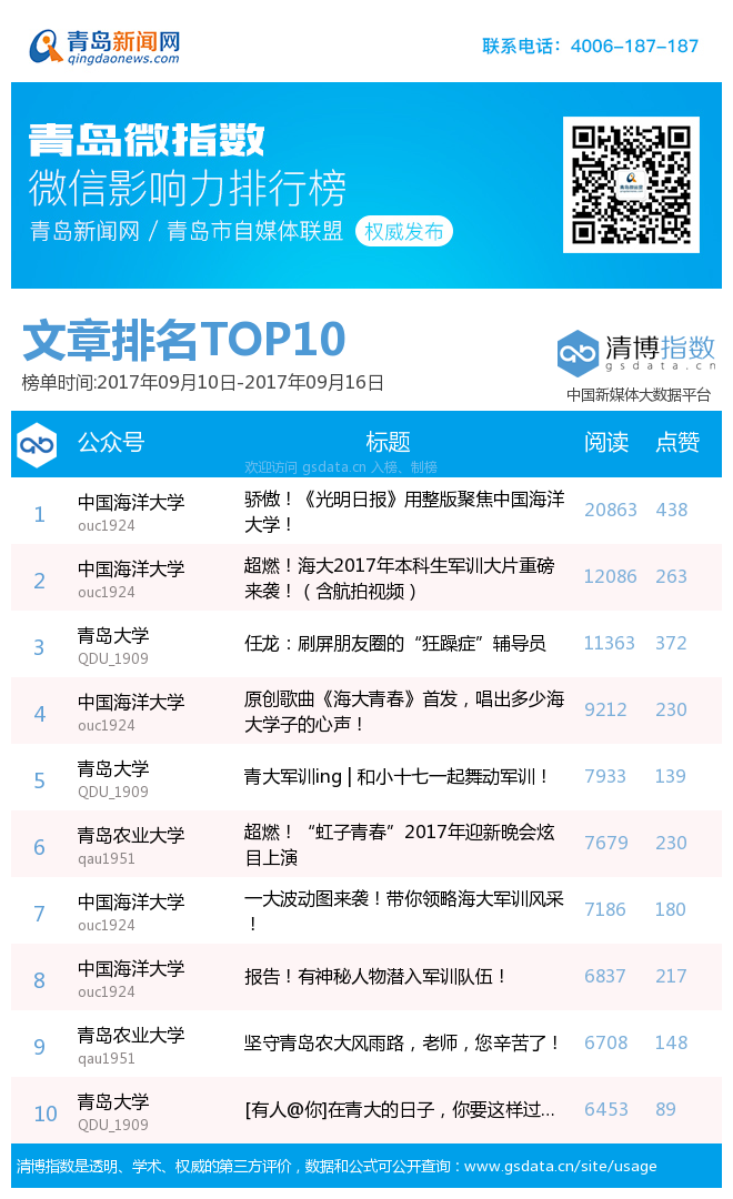 由青島新聞網(wǎng)聯(lián)合清博指數(shù)平臺(tái)聯(lián)手打造的“青島微指數(shù)微信影響力排行榜”,通過(guò)對(duì)各行業(yè)微信公眾號(hào)的日常監(jiān)測(cè),對(duì)所有賬號(hào)在統(tǒng)計(jì)周期內(nèi)所發(fā)布內(nèi)容的發(fā)文總數(shù)、總閱讀數(shù)、頭條閱讀數(shù)、平均閱讀數(shù)及總點(diǎn)贊數(shù)等海量數(shù)據(jù)進(jìn)行分析,幫助各行業(yè)新媒體小編更好地運(yùn)營(yíng)微信。