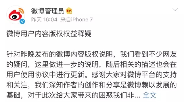 9月16日下午,@微博管理員再次對微博內(nèi)容版權(quán)做出說明。指出用戶在微博上發(fā)布的原創(chuàng)內(nèi)容,版權(quán)理所應(yīng)當(dāng)歸用戶所有,微博作為發(fā)布平臺只享有一定范圍的使用權(quán),用戶也可以根據(jù)自己的意愿發(fā)布到其他平臺。