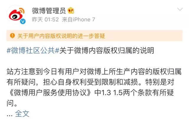 9月16日凌晨,新浪微博社區(qū)管理官方微博@微博管理員發(fā)布回應(yīng)稱,站方注意到今日有用戶對微博上所生產(chǎn)內(nèi)容的版權(quán)歸屬有所疑問,擔(dān)心自身權(quán)利受到限制和減損。特別是對《微博用戶服務(wù)使用協(xié)議》中1.31.5兩個條款有所疑問。