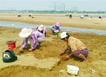昨天上午10時許,記者來到離黃島市區(qū)3公里的大漿口海域看到,蹲在海邊挖蛤蜊的市民有100多人,他們姿態(tài)各異,有蹲著的,有哈著腰的,還有干脆跪在地上的。他們用菜刀或小鋤頭將海沙挖開幾厘米深,一個個花皮蛤蜊就露了出來。記者在現(xiàn)場看到,市民李先生不一會兒就挖了一大把,樂得合不攏嘴。他告訴記者,原本是來找樂兒的,沒想到1小時就挖了七八斤。