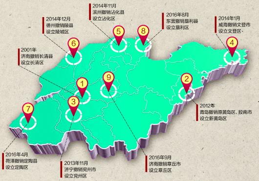 查詢發(fā)現(xiàn),在山東上述進(jìn)行撤市設(shè)區(qū)的8地中,用時(shí)最短的要數(shù)墾利,從啟動(dòng)報(bào)批到最后成行前后不過半年時(shí)間。最為波折的是章丘,2006年撤市設(shè)區(qū)的申請(qǐng)正式向上級(jí)部門提出,到2016年9月終于“十年夢(mèng)圓”。