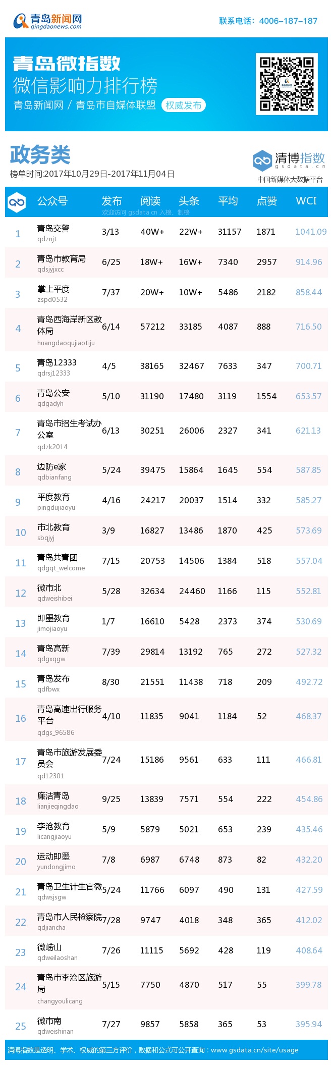 由青島新聞網(wǎng)聯(lián)合清博指數(shù)平臺聯(lián)手打造的“青島微指數(shù)微信影響力排行榜”,通過對各行業(yè)微信公眾號的日常監(jiān)測,對所有賬號在統(tǒng)計周期內(nèi)所發(fā)布內(nèi)容的發(fā)文總數(shù)、總閱讀數(shù)、頭條閱讀數(shù)、平均閱讀數(shù)及總點贊數(shù)等海量數(shù)據(jù)進行分析,幫助各行業(yè)新媒體小編更好地運營微信。