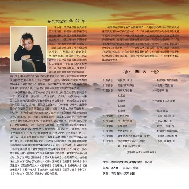 據(jù)了解,本次“盛世之韻”音樂會,將在11月17日19:30即將在青島市音樂廳(蘭山路1號)拉開帷幕,屆時李心草將攜手青島音樂廳交響樂團為大家演奏《我愛你中國》、《在希望的田野上》、《喬家大院》等百姓耳熟能詳?shù)膫鹘y(tǒng)國樂,讓交響樂貼近大眾、貼近生活,通過歌頌偉大祖國的壯闊美麗,鼓舞全市人民保持建設(shè)時尚幸?,F(xiàn)代化國際城區(qū)激情和昂揚斗志。