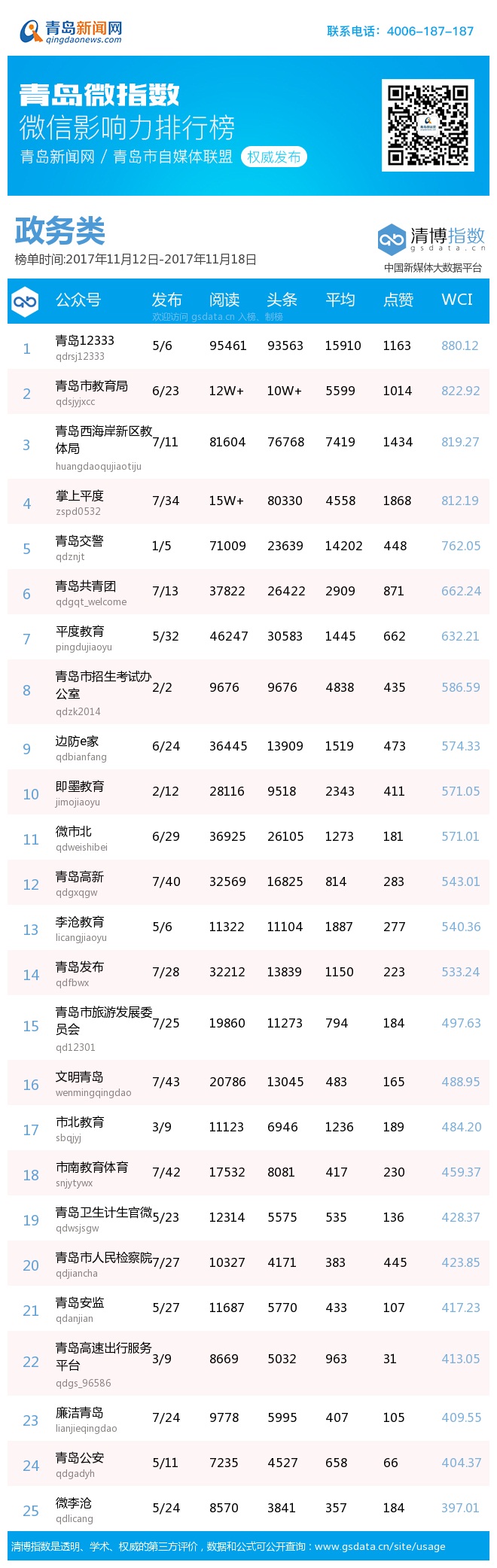 由青島新聞網(wǎng)聯(lián)合清博指數(shù)平臺(tái)聯(lián)手打造的“青島微指數(shù)微信影響力排行榜”,通過(guò)對(duì)各行業(yè)微信公眾號(hào)的日常監(jiān)測(cè),對(duì)所有賬號(hào)在統(tǒng)計(jì)周期內(nèi)所發(fā)布內(nèi)容的發(fā)文總數(shù)、總閱讀數(shù)、頭條閱讀數(shù)、平均閱讀數(shù)及總點(diǎn)贊數(shù)等海量數(shù)據(jù)進(jìn)行分析,幫助各行業(yè)新媒體小編更好地運(yùn)營(yíng)微信。