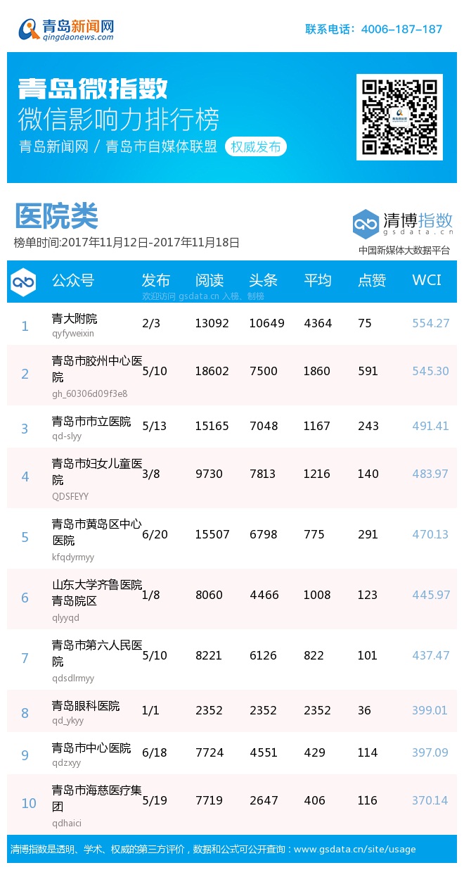 由青島新聞網(wǎng)聯(lián)合清博指數(shù)平臺(tái)聯(lián)手打造的“青島微指數(shù)微信影響力排行榜”,通過對(duì)各行業(yè)微信公眾號(hào)的日常監(jiān)測(cè),對(duì)所有賬號(hào)在統(tǒng)計(jì)周期內(nèi)所發(fā)布內(nèi)容的發(fā)文總數(shù)、總閱讀數(shù)、頭條閱讀數(shù)、平均閱讀數(shù)及總點(diǎn)贊數(shù)等海量數(shù)據(jù)進(jìn)行分析,幫助各行業(yè)新媒體小編更好地運(yùn)營(yíng)微信。