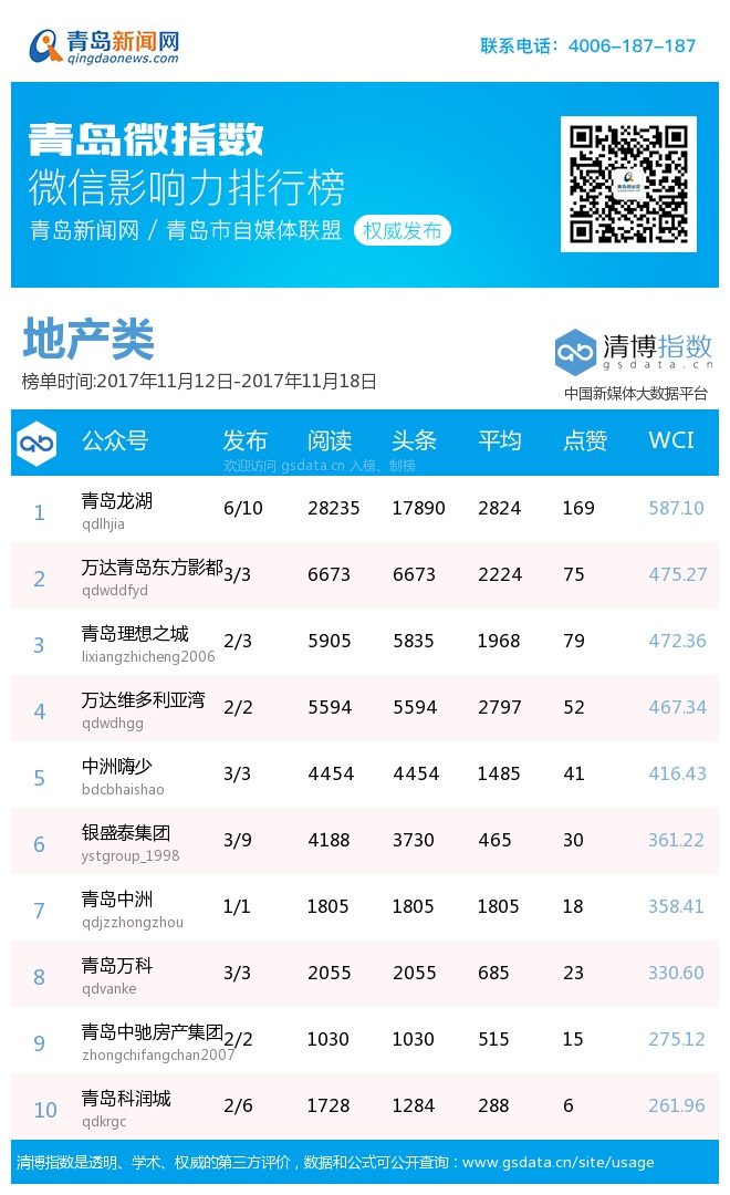 由青島新聞網(wǎng)聯(lián)合清博指數(shù)平臺聯(lián)手打造的“青島微指數(shù)微信影響力排行榜”,通過對各行業(yè)微信公眾號的日常監(jiān)測,對所有賬號在統(tǒng)計周期內(nèi)所發(fā)布內(nèi)容的發(fā)文總數(shù)、總閱讀數(shù)、頭條閱讀數(shù)、平均閱讀數(shù)及總點贊數(shù)等海量數(shù)據(jù)進(jìn)行分析,幫助各行業(yè)新媒體小編更好地運營微信。