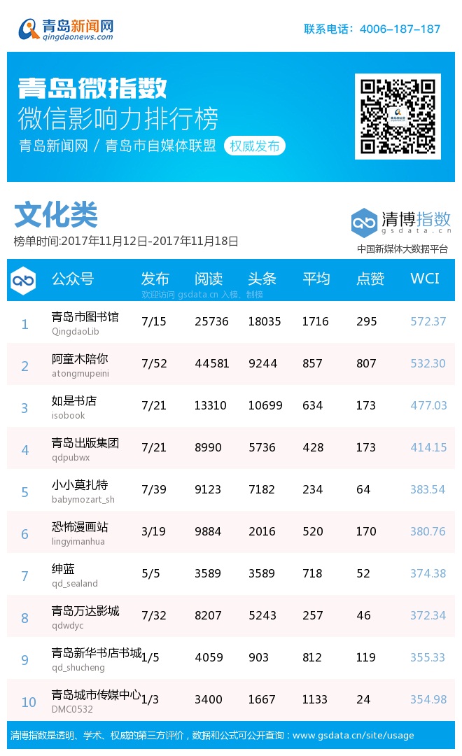 由青島新聞網(wǎng)聯(lián)合清博指數(shù)平臺(tái)聯(lián)手打造的“青島微指數(shù)微信影響力排行榜”,通過(guò)對(duì)各行業(yè)微信公眾號(hào)的日常監(jiān)測(cè),對(duì)所有賬號(hào)在統(tǒng)計(jì)周期內(nèi)所發(fā)布內(nèi)容的發(fā)文總數(shù)、總閱讀數(shù)、頭條閱讀數(shù)、平均閱讀數(shù)及總點(diǎn)贊數(shù)等海量數(shù)據(jù)進(jìn)行分析,幫助各行業(yè)新媒體小編更好地運(yùn)營(yíng)微信。