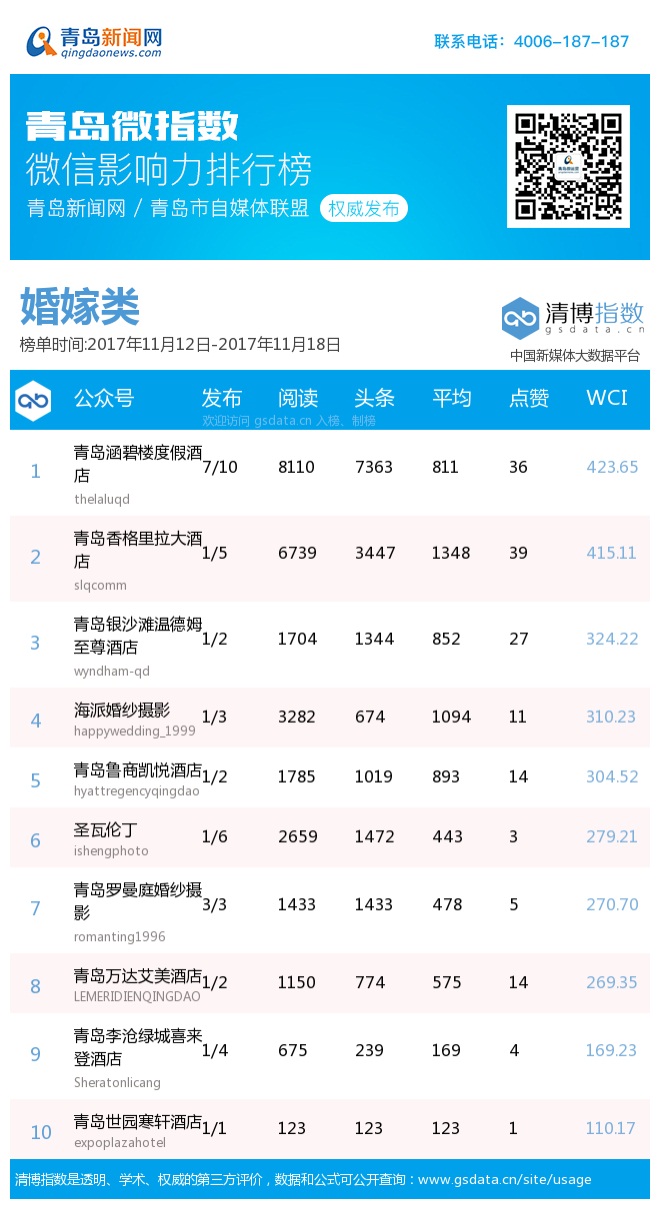 由青島新聞網(wǎng)聯(lián)合清博指數(shù)平臺(tái)聯(lián)手打造的“青島微指數(shù)微信影響力排行榜”,通過(guò)對(duì)各行業(yè)微信公眾號(hào)的日常監(jiān)測(cè),對(duì)所有賬號(hào)在統(tǒng)計(jì)周期內(nèi)所發(fā)布內(nèi)容的發(fā)文總數(shù)、總閱讀數(shù)、頭條閱讀數(shù)、平均閱讀數(shù)及總點(diǎn)贊數(shù)等海量數(shù)據(jù)進(jìn)行分析,幫助各行業(yè)新媒體小編更好地運(yùn)營(yíng)微信。