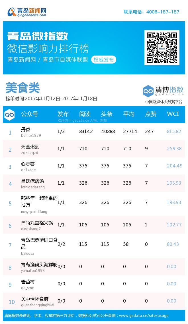 由青島新聞網(wǎng)聯(lián)合清博指數(shù)平臺聯(lián)手打造的“青島微指數(shù)微信影響力排行榜”,通過對各行業(yè)微信公眾號的日常監(jiān)測,對所有賬號在統(tǒng)計周期內(nèi)所發(fā)布內(nèi)容的發(fā)文總數(shù)、總閱讀數(shù)、頭條閱讀數(shù)、平均閱讀數(shù)及總點贊數(shù)等海量數(shù)據(jù)進(jìn)行分析,幫助各行業(yè)新媒體小編更好地運營微信。
