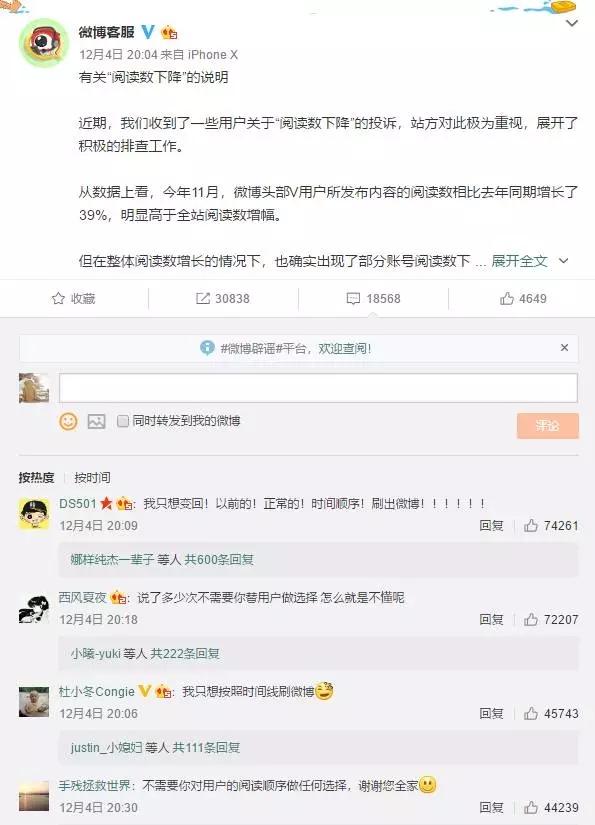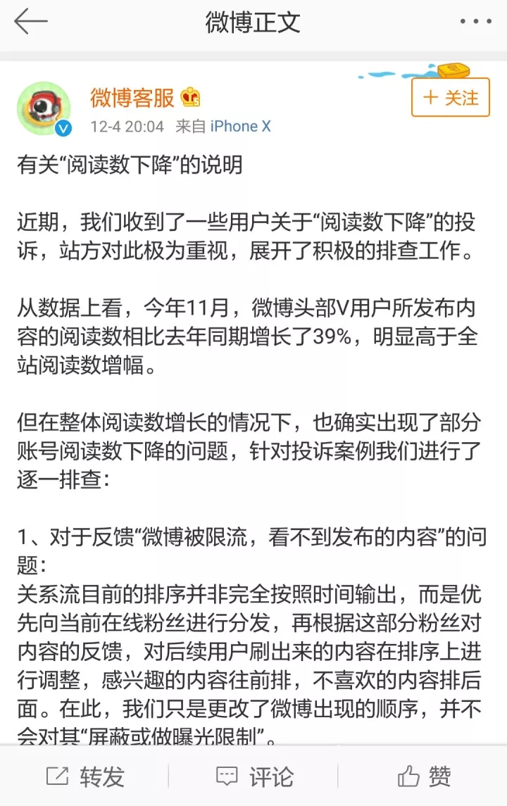 以下是新浪微博客服有關(guān)“閱讀數(shù)下降”的說明: