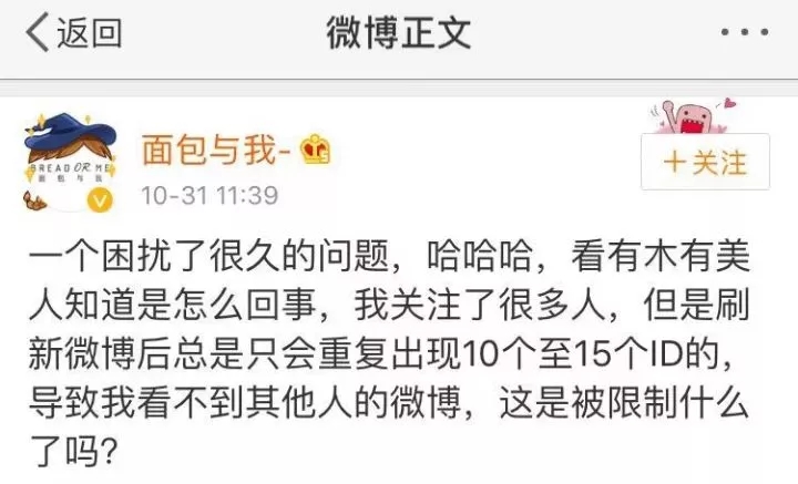 比如這位美食博主發(fā)現(xiàn),自己關(guān)注了很多人,但是刷新微博后總是只會重復(fù)出現(xiàn)10-15個ID的信息,導(dǎo)致看不到其他人的微博。