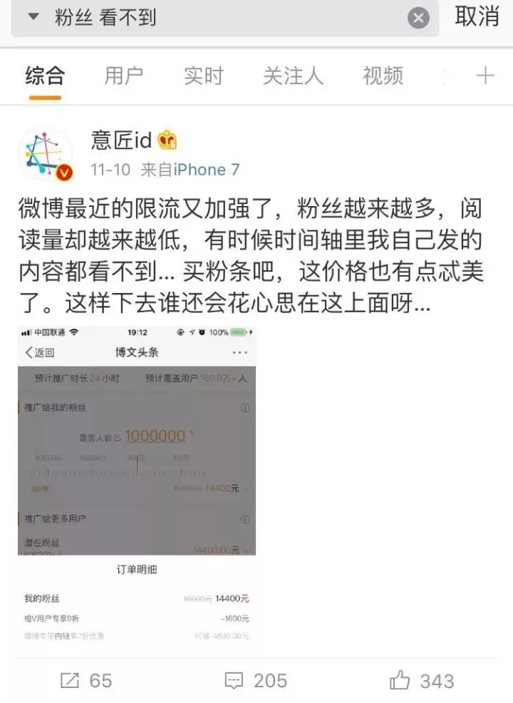 粉絲看不到關(guān)注人的微博自然會困惑,但是更加困惑的,是早期為微博帶來巨大流量的大V們。從2010年開始玩微博的知名美學(xué)設(shè)計博主、金V用戶“意匠id”吐槽,粉絲越來越多,閱讀量卻越來越低,有時候時間軸里自己發(fā)的內(nèi)容都看不到。