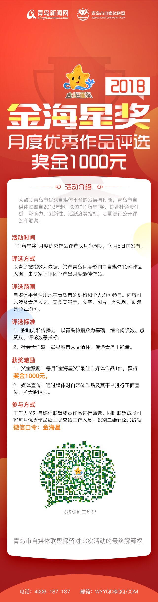 二、評(píng)選方式:以青島微指數(shù)為依據(jù),篩選青島月度影響力自媒體10件作品入圍,由專(zhuān)家評(píng)審團(tuán)評(píng)選出月度最佳作品。