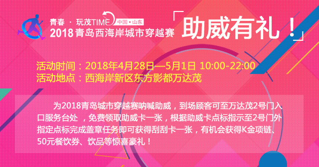 除參加比賽有機(jī)會(huì)贏大獎(jiǎng)外,為穿越賽助威也有好禮相送!4月28日-5月1日10:00-22:00期間,至萬(wàn)達(dá)茂1號(hào)門入口處可免費(fèi)領(lǐng)取助威卡一張,根據(jù)助威卡指示至3個(gè)點(diǎn)位完成合影任務(wù)即可獲得刮刮卡一張,100%有獎(jiǎng),有機(jī)會(huì)獲得K金項(xiàng)鏈、50元餐飲券、飲品等驚喜好禮!一起來(lái)為2018青島西海岸城市穿越賽加油助威吧!