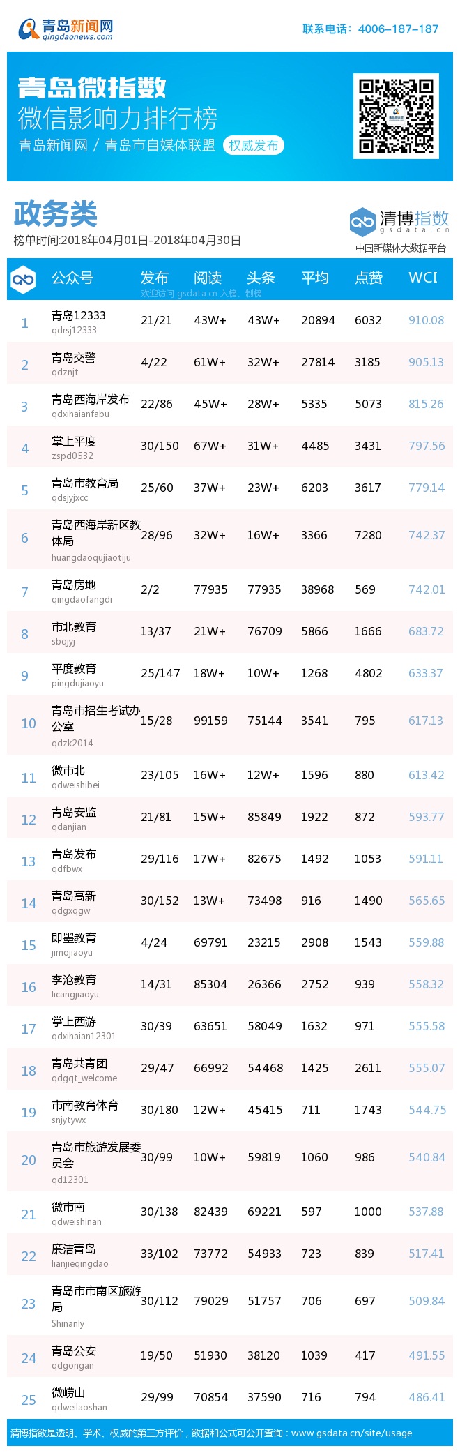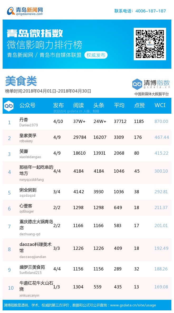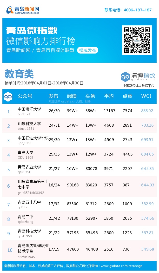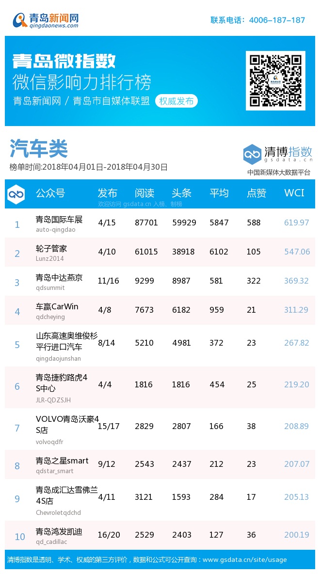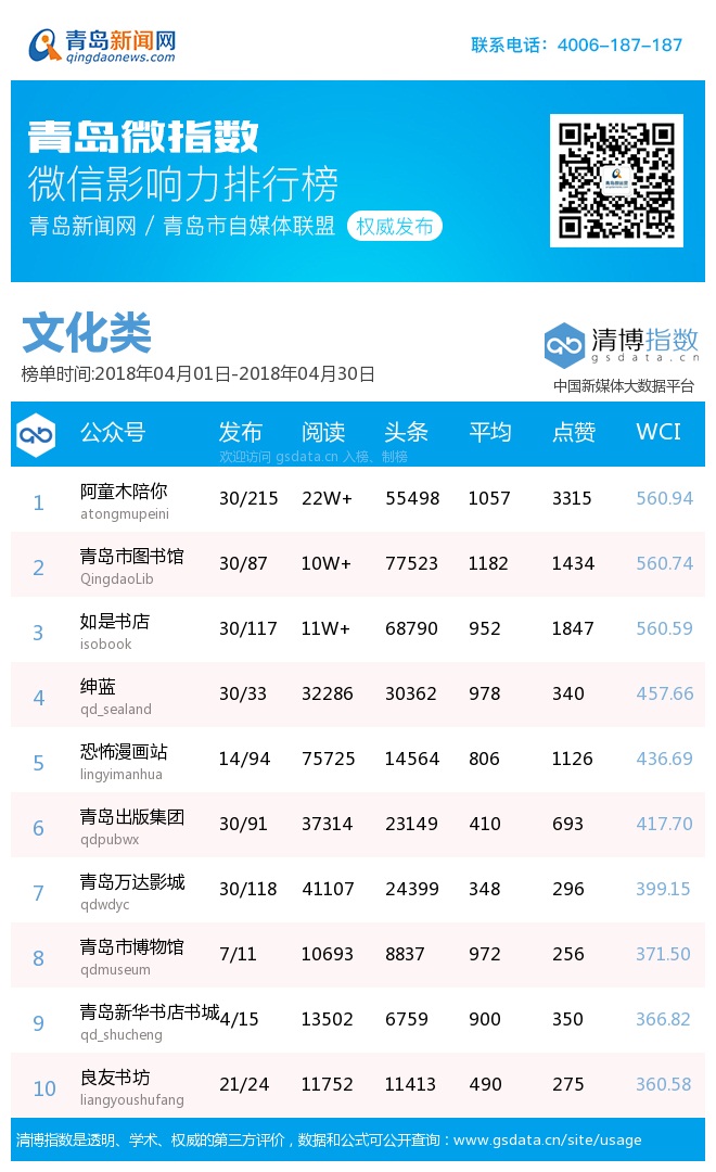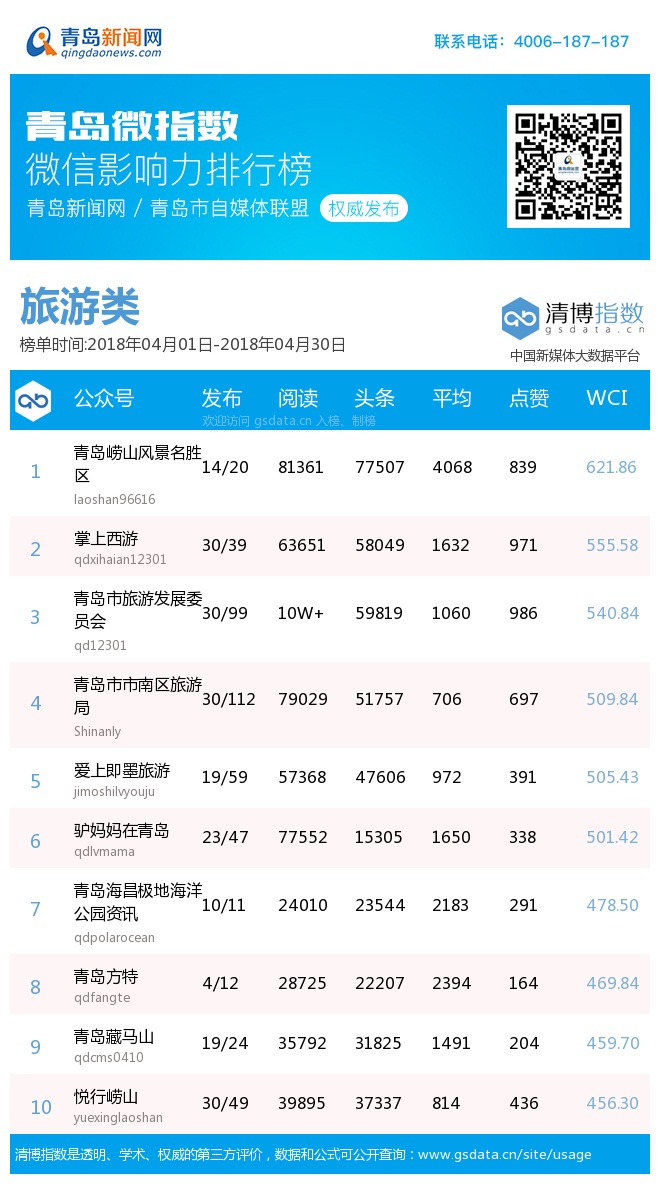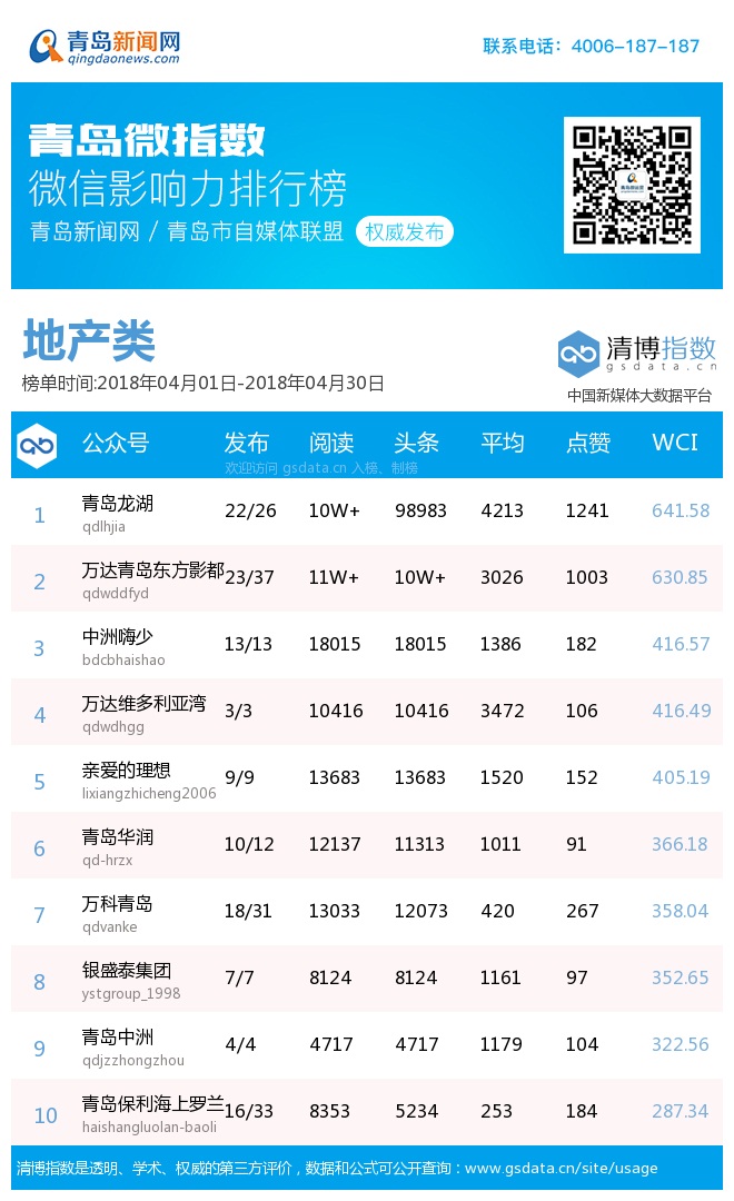 3、本次榜單收錄了青島14個行業(yè)微信公眾號,如您的賬號暫未收錄,可聯(lián)系4006-187-187。