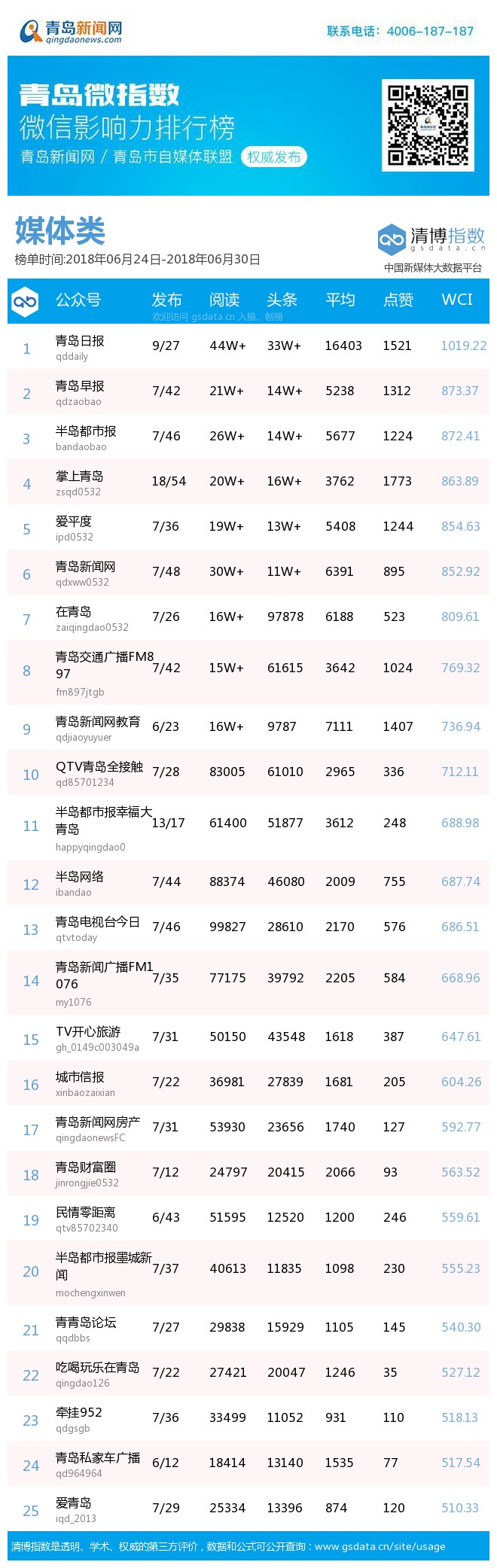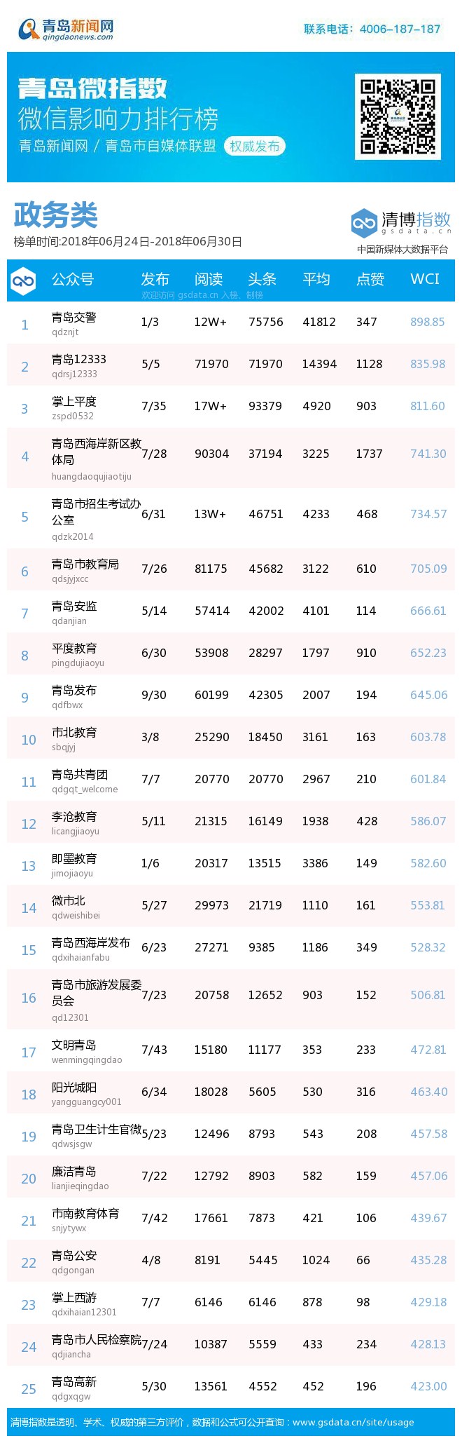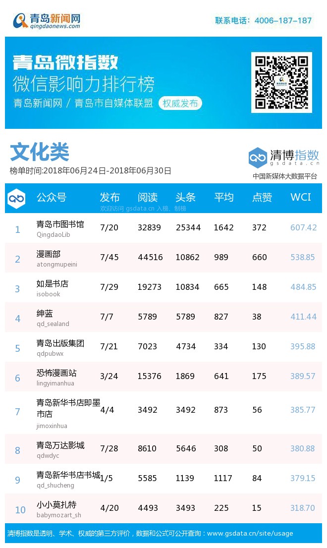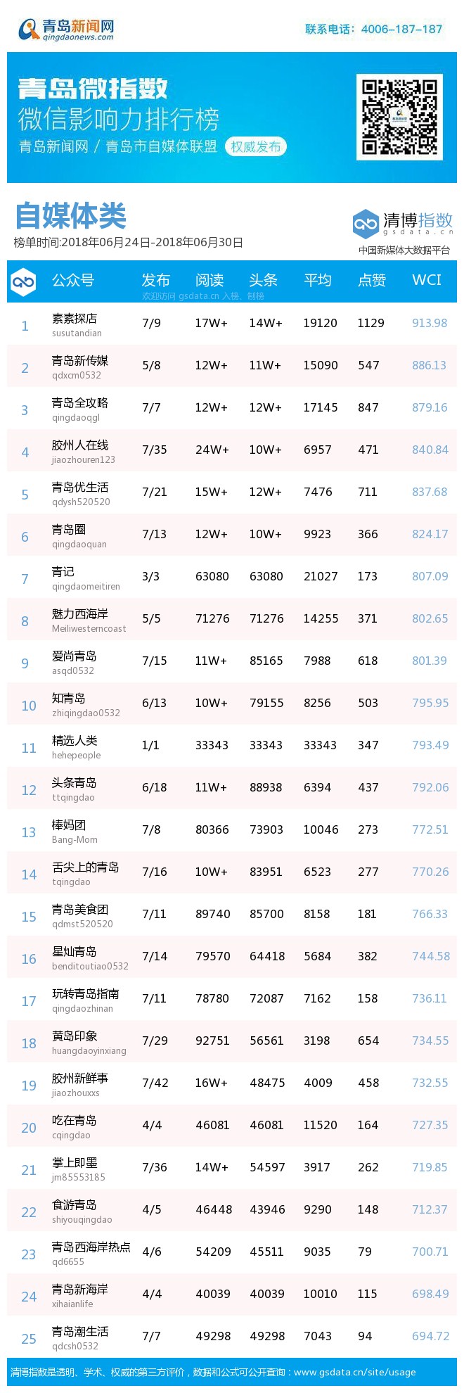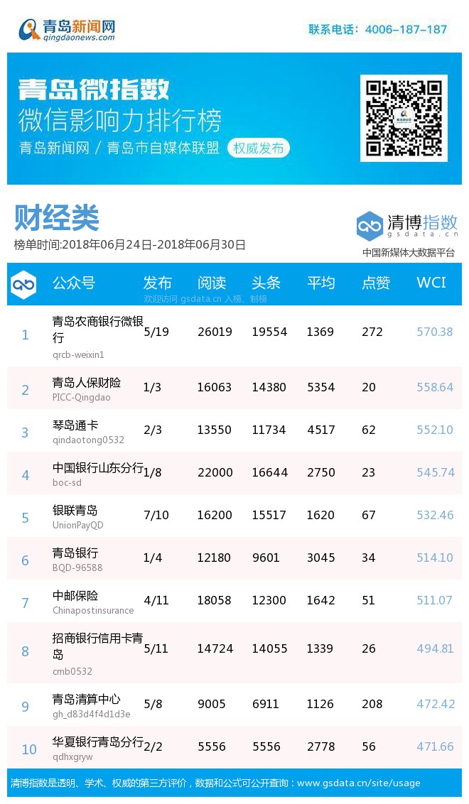 青島新聞網(wǎng)7月2日訊(記者 邢書玲)由青島新聞網(wǎng)、清博指數(shù)平臺聯(lián)手打造的“青島微指數(shù)微信影響力排行榜”今日發(fā)布一周(6.24—6.30)榜單。