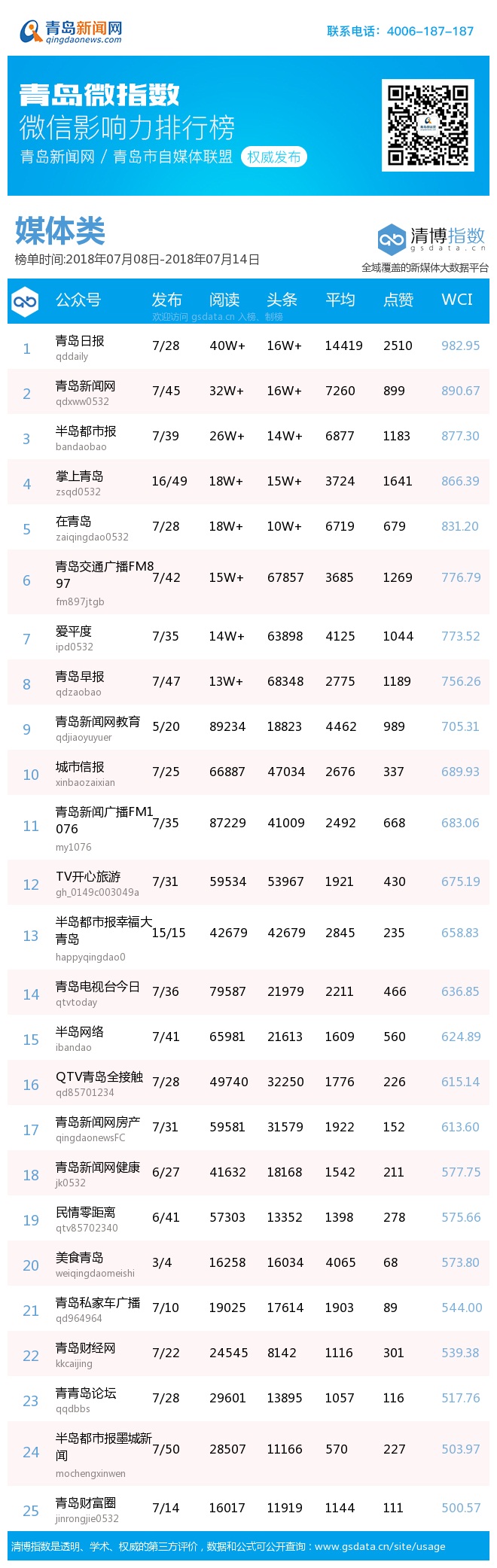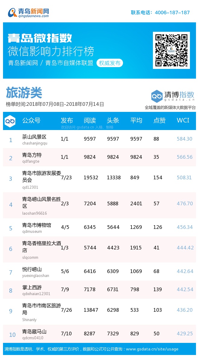 3、本次榜單收錄了青島14個行業(yè)微信公眾號,如您的賬號暫未收錄,可聯(lián)系4006-187-187。