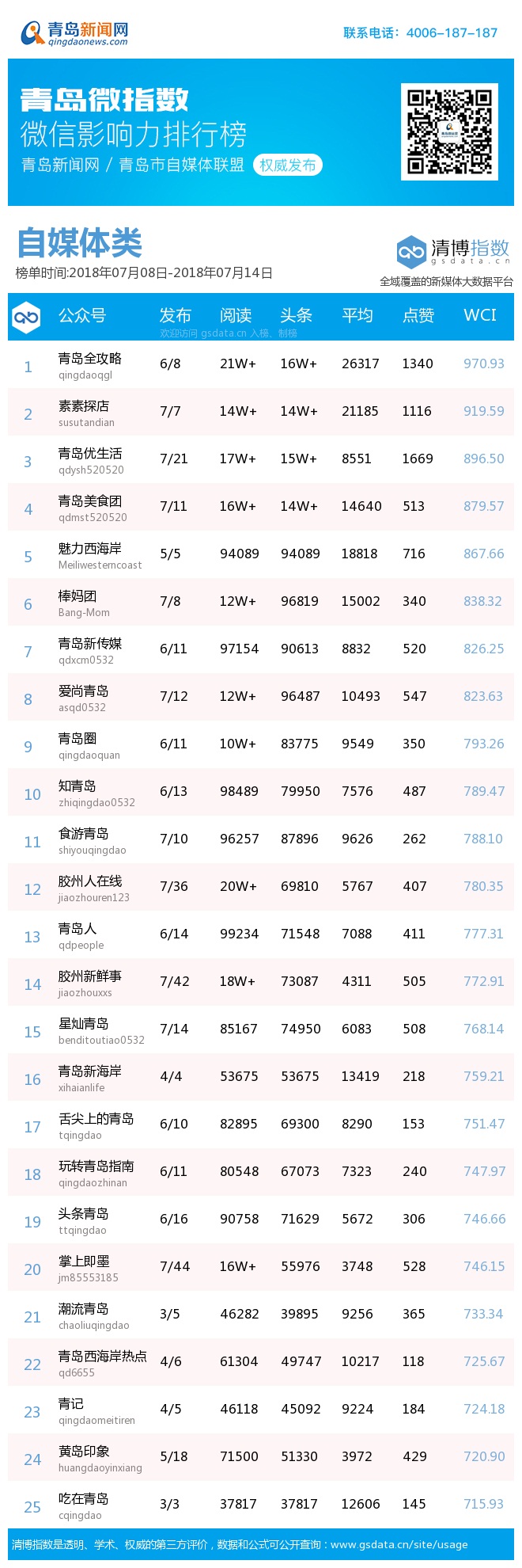 青島新聞網(wǎng)7月16日訊(記者 邢書玲)由青島新聞網(wǎng)、清博指數(shù)平臺聯(lián)手打造的“青島微指數(shù)微信影響力排行榜”今日發(fā)布一周(7.8—7.14)榜單。