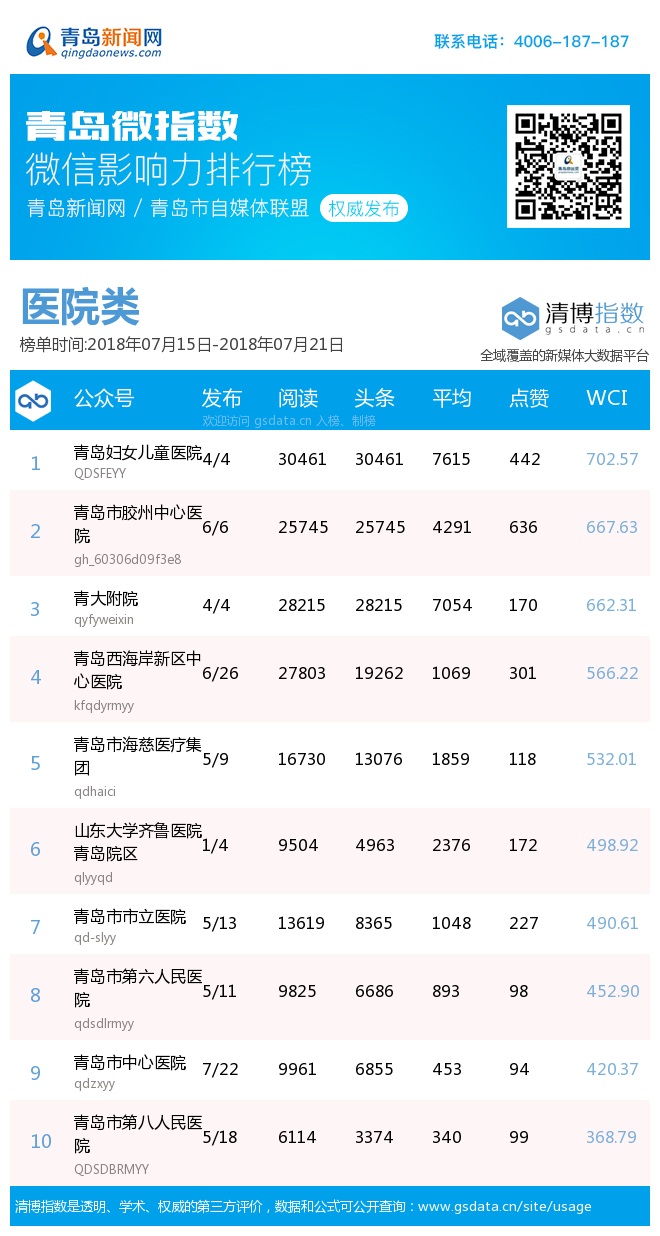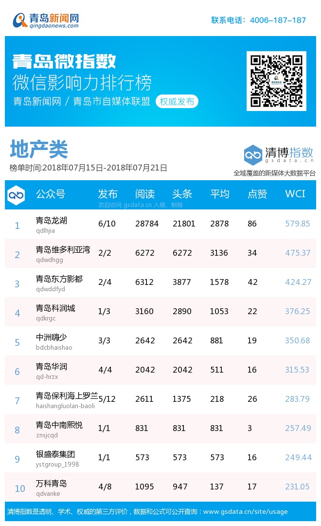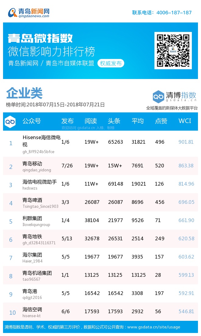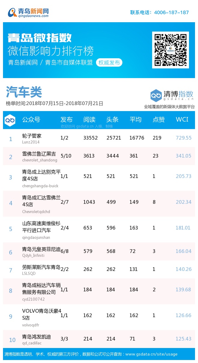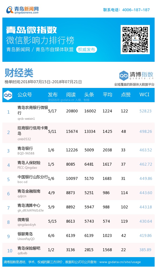 3、本次榜單收錄了青島14個行業(yè)微信公眾號,如您的賬號暫未收錄,可聯(lián)系4006-187-187。