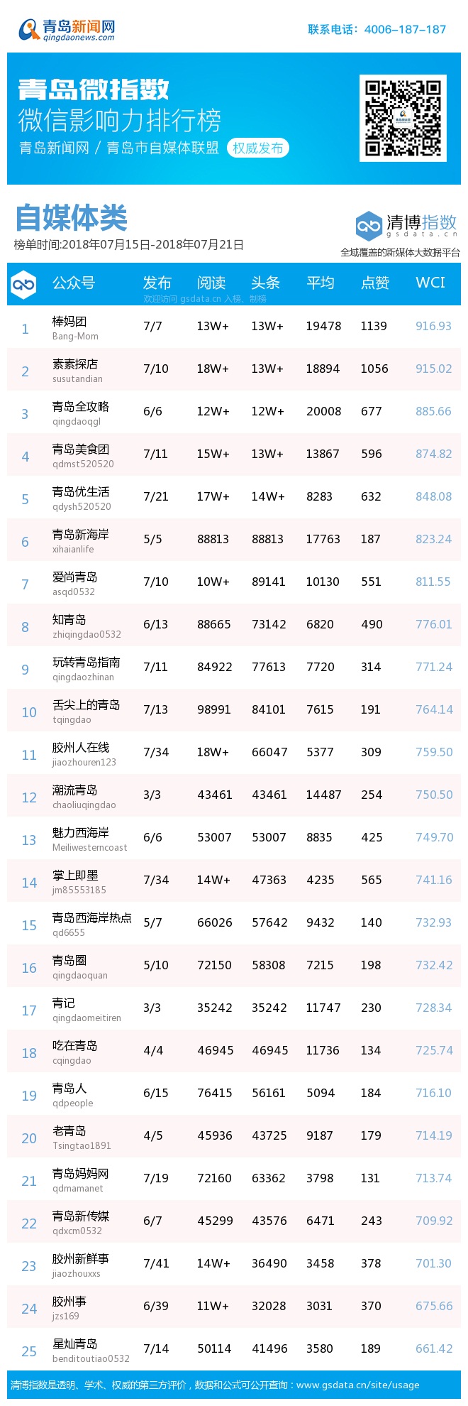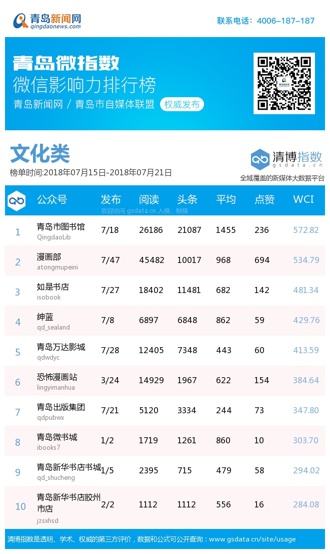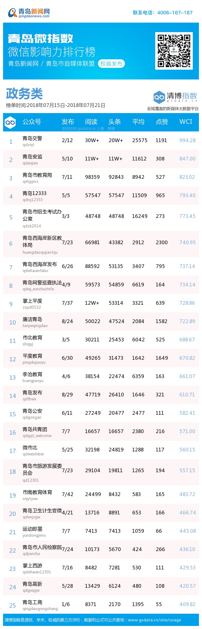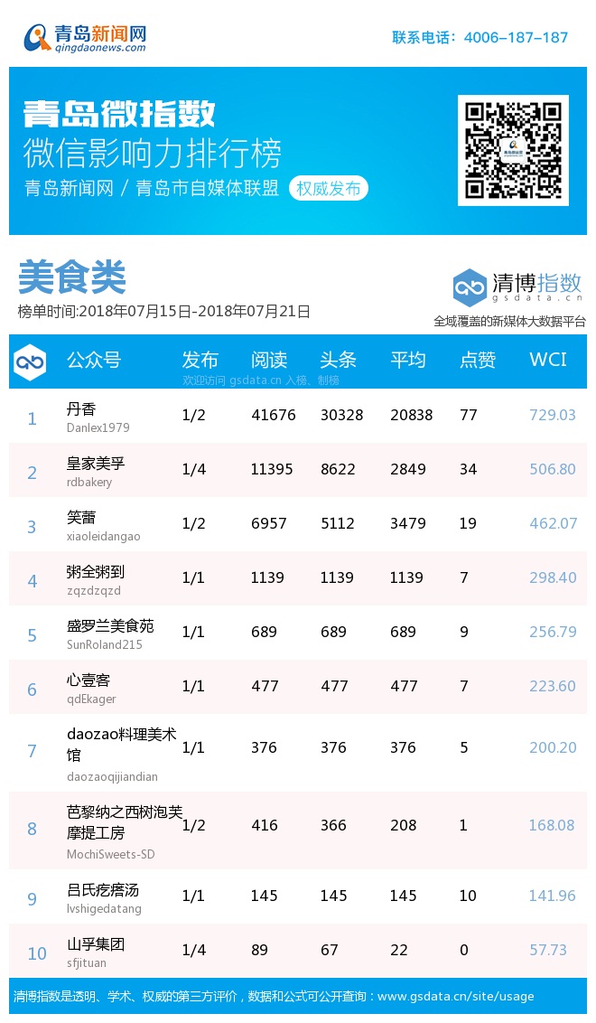 3、本次榜單收錄了青島14個行業(yè)微信公眾號,如您的賬號暫未收錄,可聯(lián)系4006-187-187。