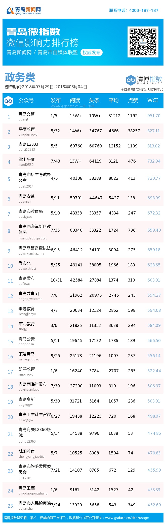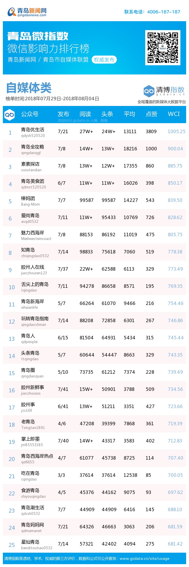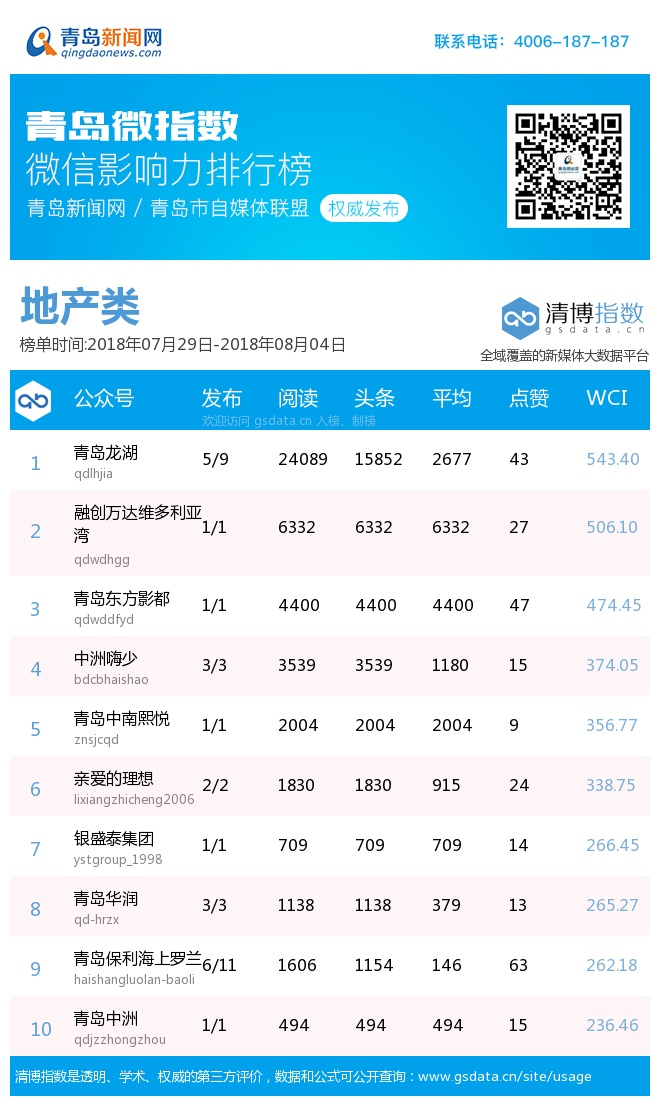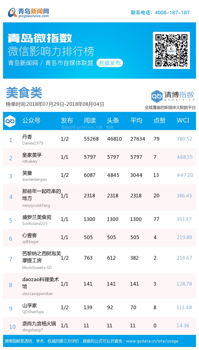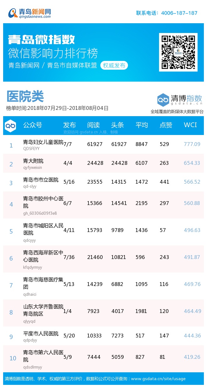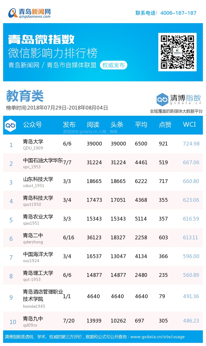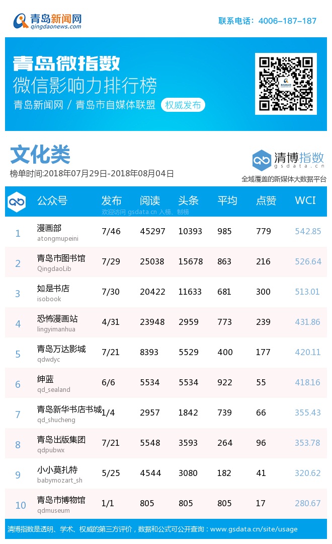 青島新聞網(wǎng)8月6日訊(記者 邢書玲)由青島新聞網(wǎng)、清博指數(shù)平臺(tái)聯(lián)手打造的“青島微指數(shù)微信影響力排行榜”今日發(fā)布一周(7月29日-8月4日)榜單。