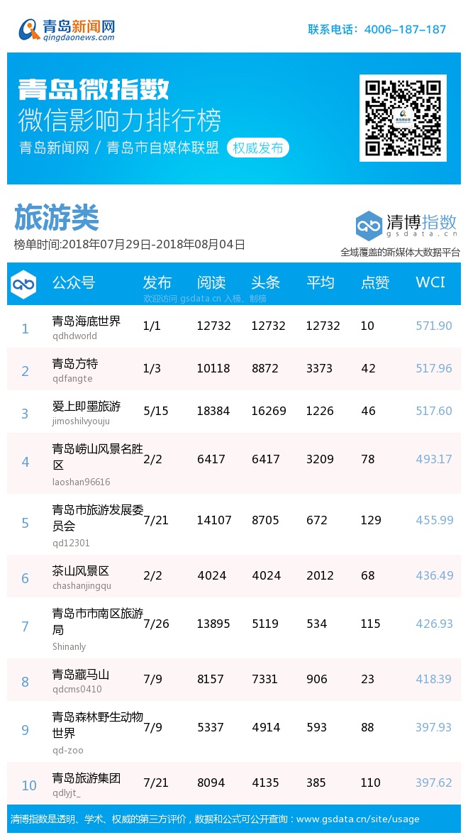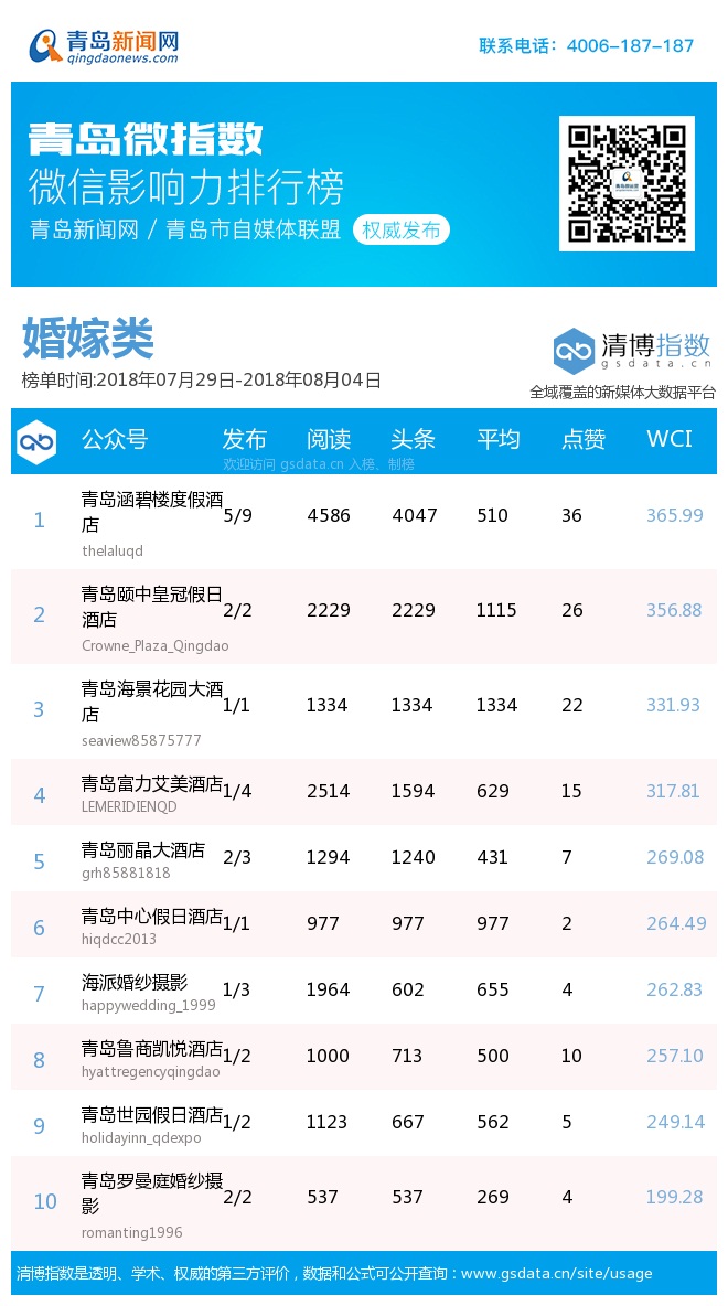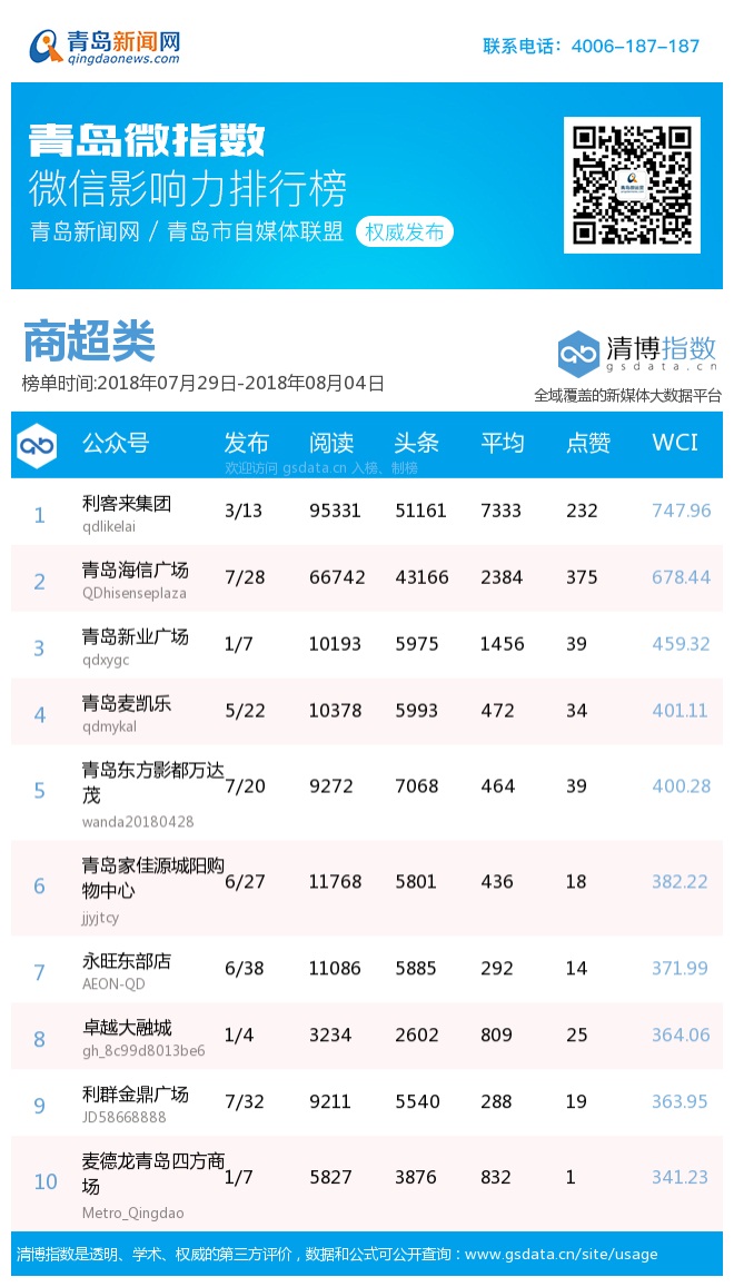 3、本次榜單收錄了青島14個(gè)行業(yè)微信公眾號(hào),如您的賬號(hào)暫未收錄,可聯(lián)系4006-187-187。
