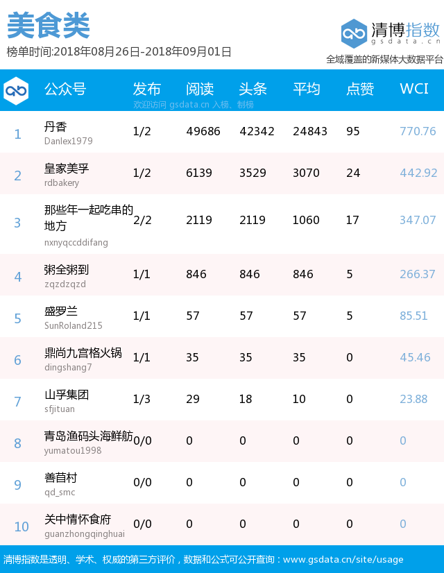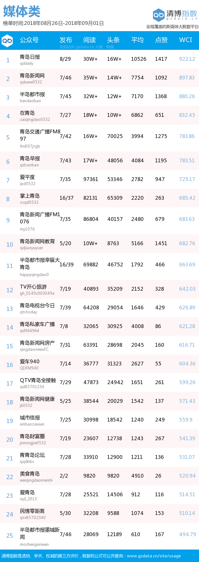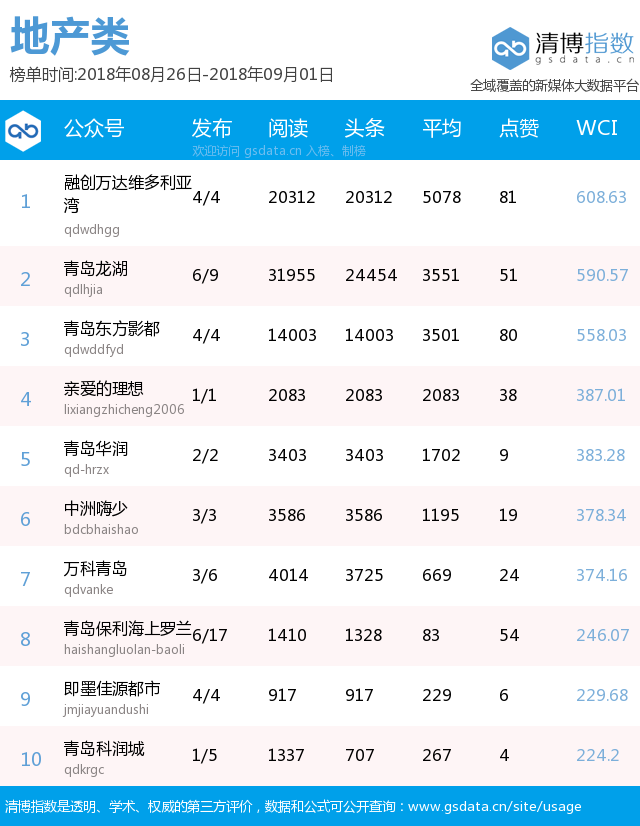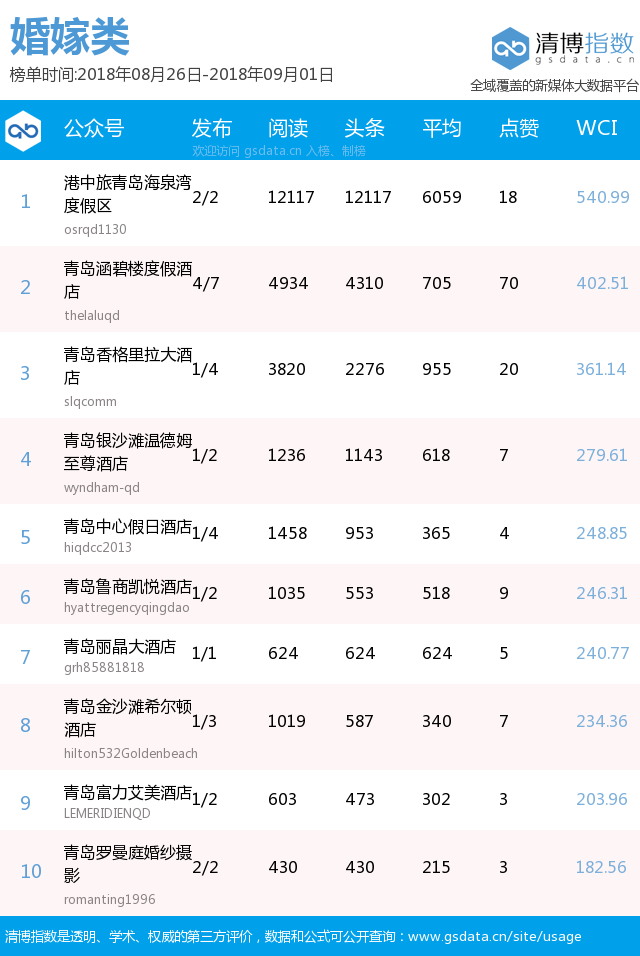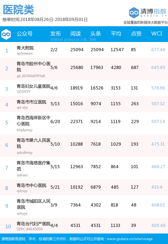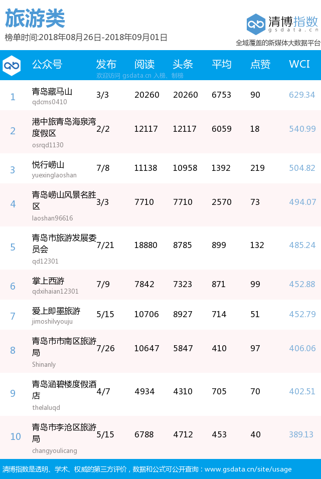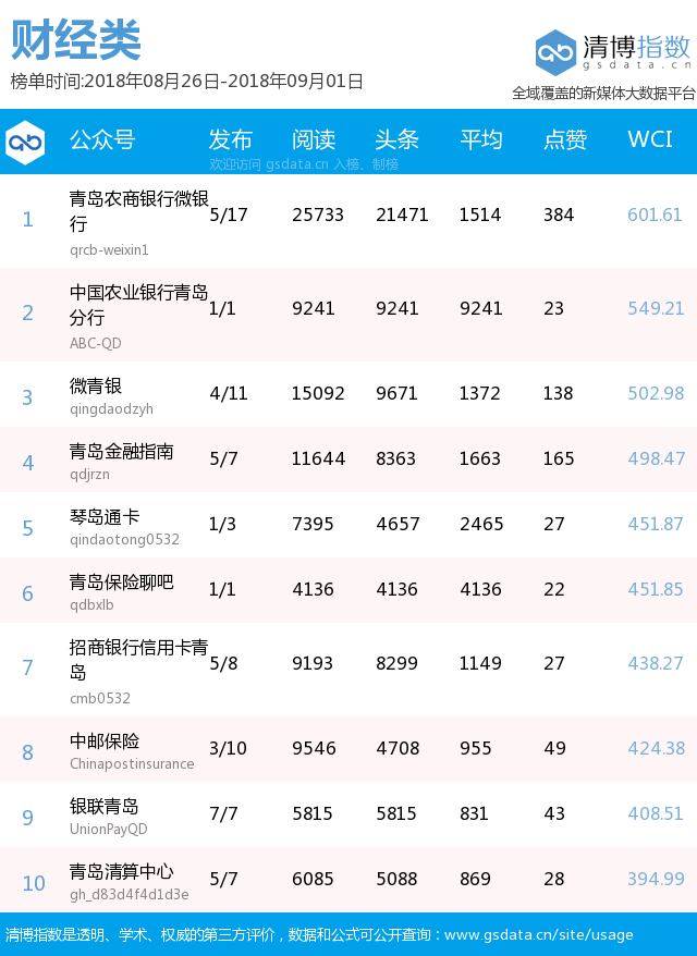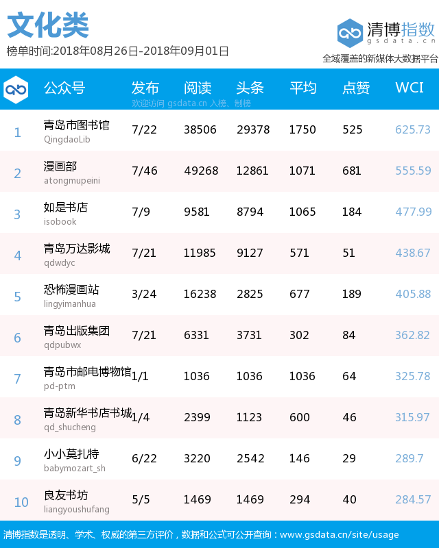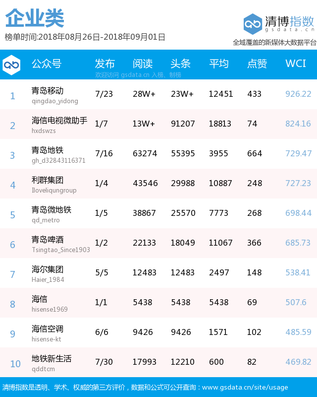 青島新聞網(wǎng)9月3日訊(記者 邢書玲)由青島新聞網(wǎng)、清博指數(shù)平臺聯(lián)手打造的“青島微指數(shù)微信影響力排行榜”今日發(fā)布一周(8月26日-9月1日)榜單。