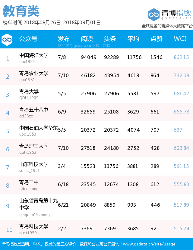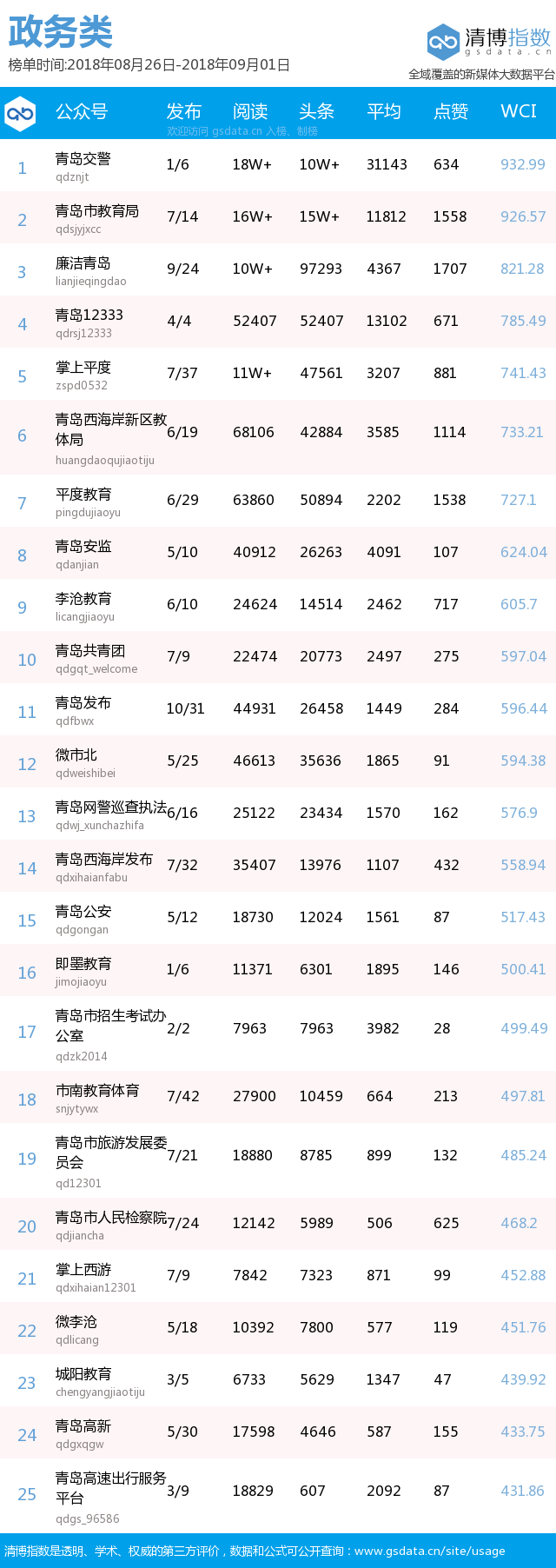 本期政務(wù)榜前五名分別由“青島交警”、“青島市教育局”、“廉潔青島”、“青島12333”、“掌上平度”奪得,其中“廉潔青島”較上期前進七個名次,其發(fā)布的兩起涉黑涉惡典型問題通報,受到市民一致關(guān)注,最終以總閱讀10萬+,點贊1707次的成績,拿下本期第3名。另外,本期政務(wù)榜還收獲兩篇10萬+熱文,分別是“青島市教育局”發(fā)布的“《開學(xué)第一課》節(jié)目單新鮮出爐!今天晚上不見不散”以及“青島交警”發(fā)布的“【回音壁】膠州灣隧道又將有新措施!諸多措施為哪般?”。