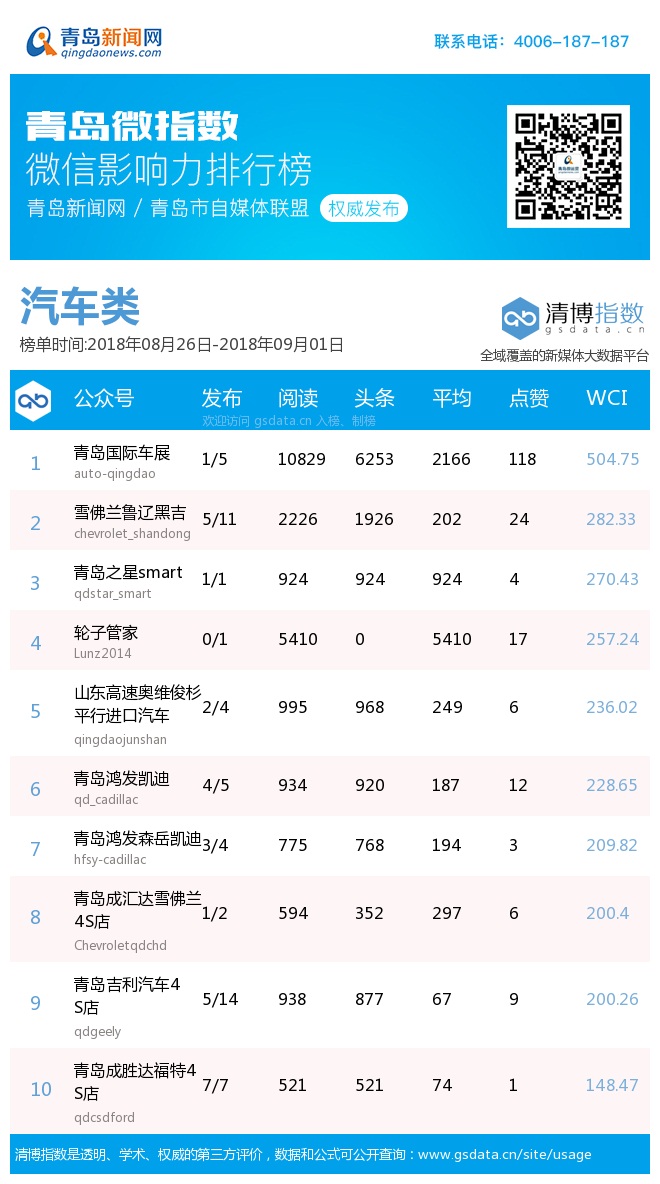 3、本次榜單收錄了青島14個行業(yè)微信公眾號,如您的賬號暫未收錄,可聯(lián)系4006-187-187。