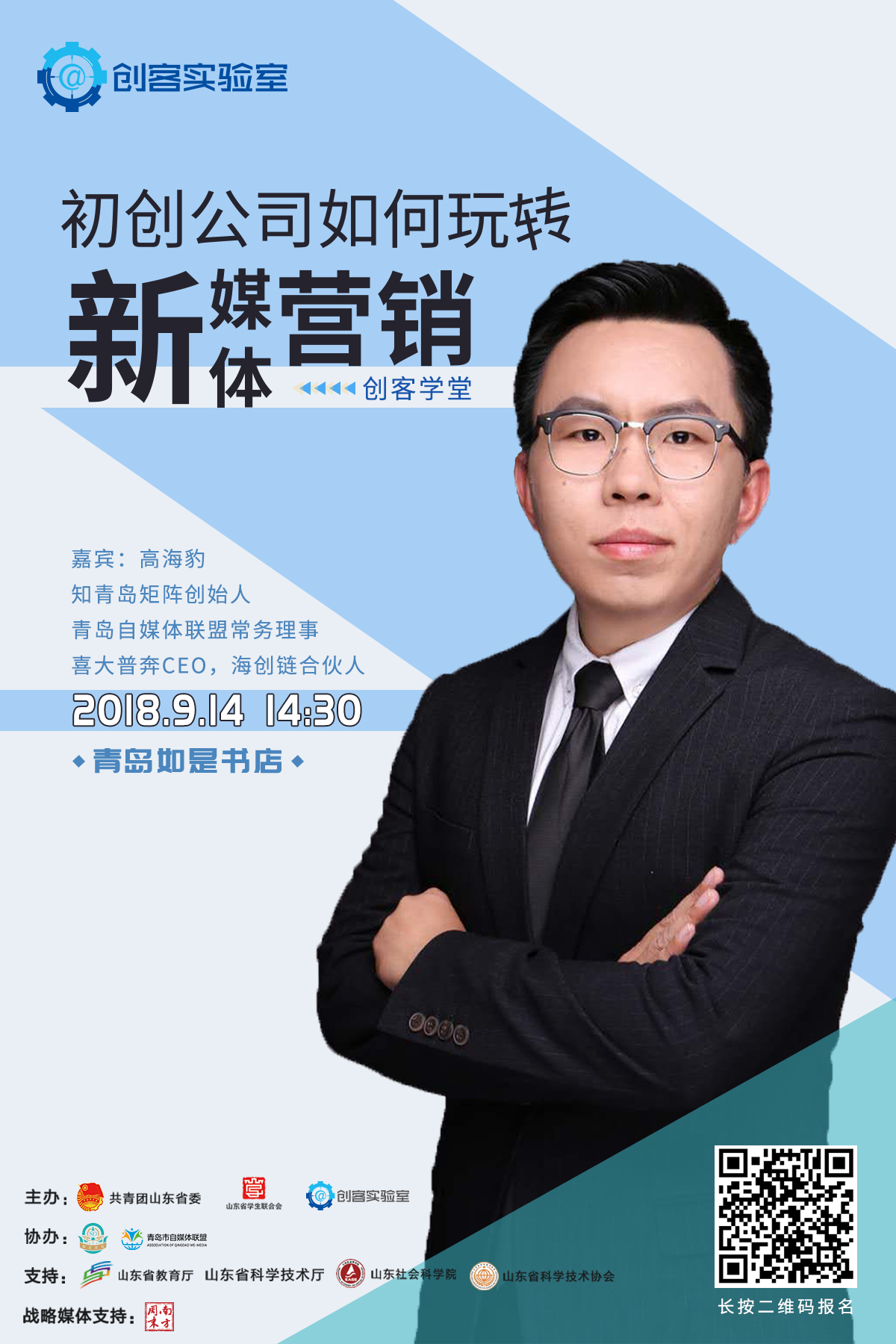 9月14日,青島自媒體聯(lián)盟常任理事、知青島創(chuàng)始人高海豹,將出席創(chuàng)客學(xué)堂,為大家?guī)硪粓?chǎng)“初創(chuàng)公司如何玩轉(zhuǎn)新媒體營(yíng)銷”的主題分享。