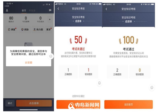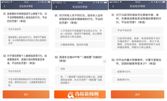 今天起持續(xù)十天,滴滴司機們每天打開車主端APP,除了要進行人臉識別外,還需要參與安全知識問答。每次考試包括兩道選擇題,兩題均回答正確才算通過,如果兩題中有一題回答錯誤則為考試失敗,司機需要重新考試直到通過,才能正常出車。選擇題內(nèi)容涵蓋了出行過程中的多項安全相關(guān)問題,比如滴滴安全保障制度、違反安全服務規(guī)則的處罰措施、“一鍵報警”等APP內(nèi)安全功能的使用方式、安全駕駛規(guī)范以及如何與乘客文明友好溝通等。