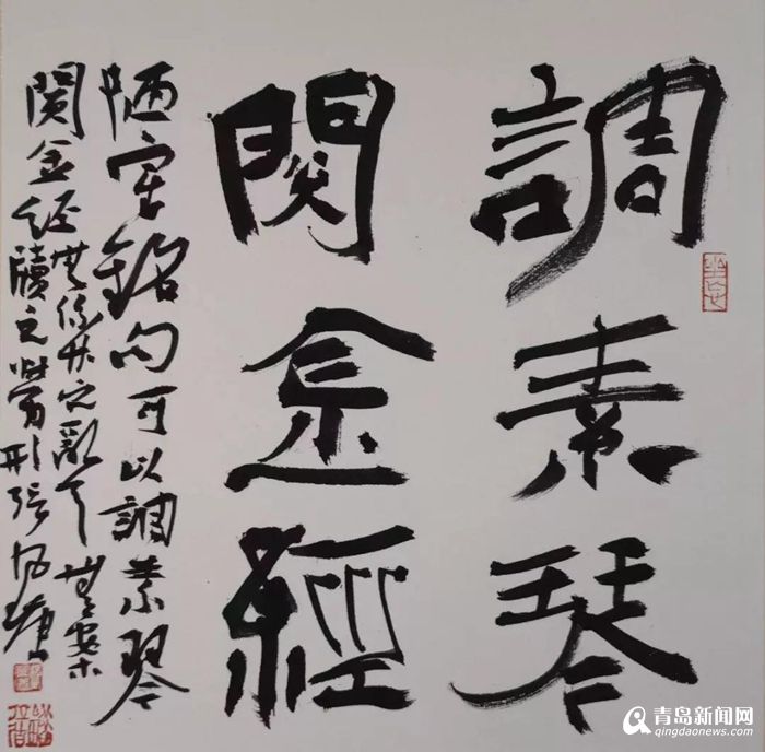 書(shū)法小斗方《調(diào)素琴閱金經(jīng)》,以篆隸筆法為主,古拙樸茂,風(fēng)神皆備。