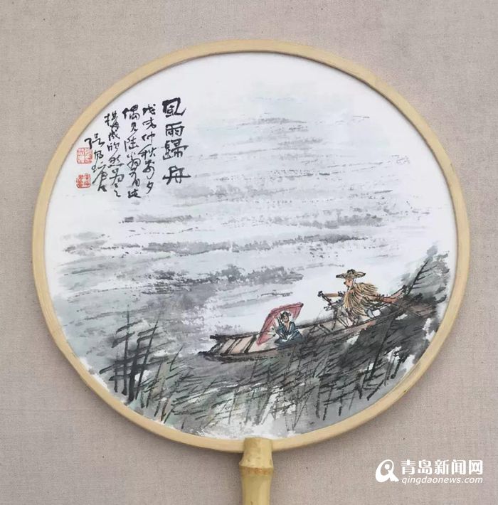 張鳳塘的山水小品,有小斗方,有小橫批,也有小團(tuán)扇。大不過(guò)兩尺,小不過(guò)十寸,大氣精致,意境深邃。其中團(tuán)扇《風(fēng)雨歸舟》圖,直徑不過(guò)20厘米,畫(huà)面內(nèi)有滄水浩波、蘆葦搖曳,漁翁披風(fēng)帶雨載舟而歸,讓人聯(lián)想到“風(fēng)蕭蕭兮易水寒”的悲涼之感。
