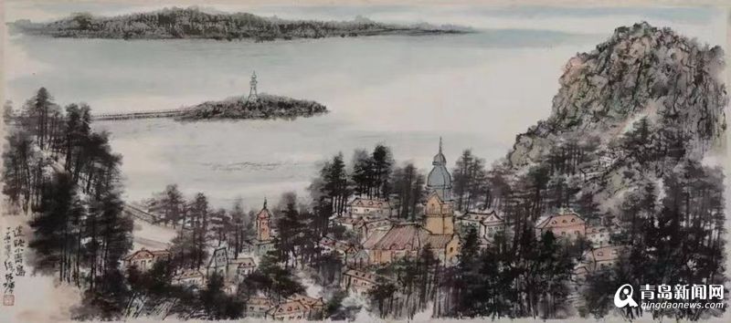 山水橫批《青島攬勝》,高22厘米,寬48厘米,僅有一尺見(jiàn)方的卷幅,將匯泉灣、太平山、老城區(qū)、五四廣場(chǎng)等青島元素盡攬其中,以小見(jiàn)大、氣象萬(wàn)千。